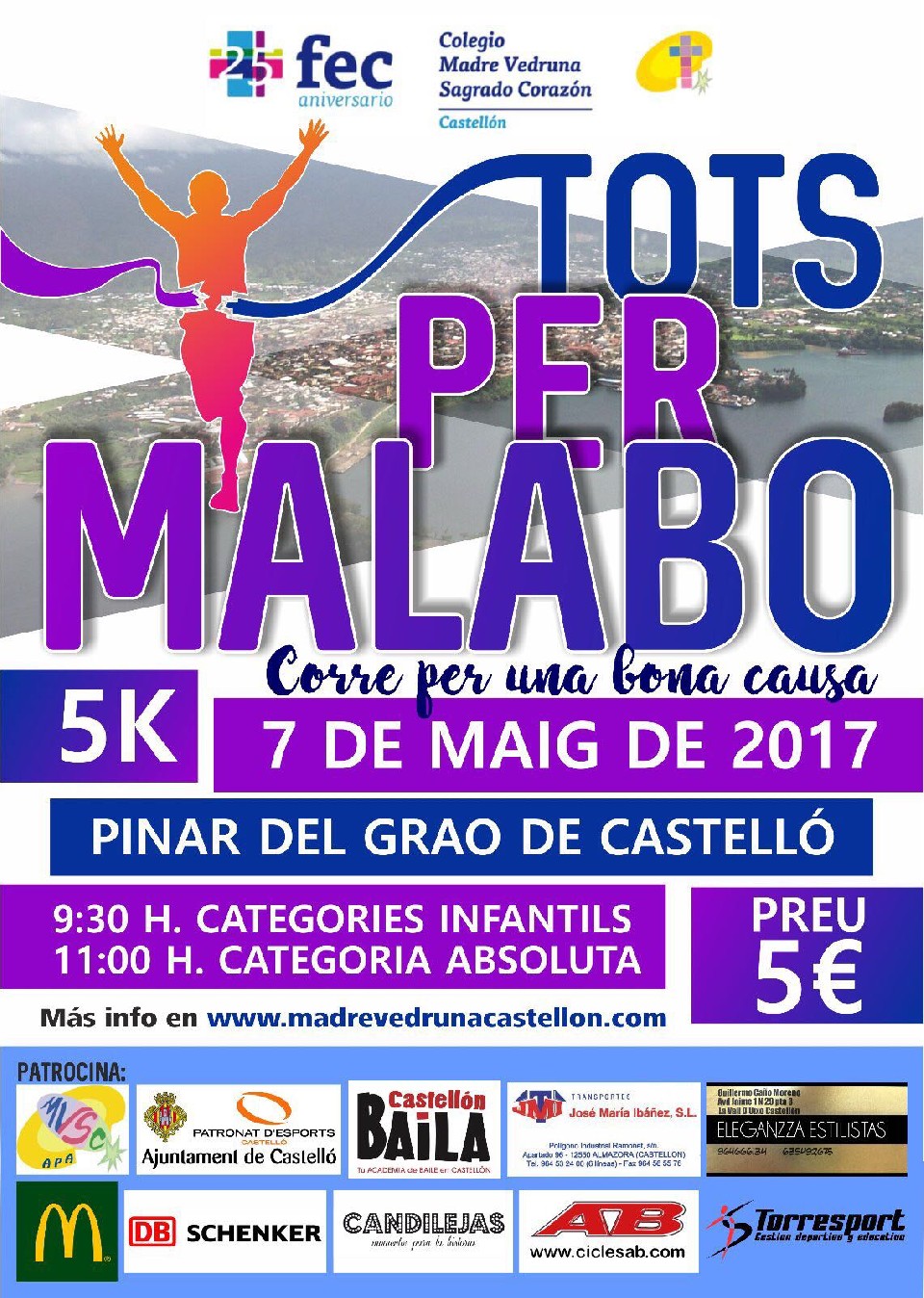 Artículo 1. – El Colegio Madre Vedruna de Castellón, con la colaboración del Ayuntamiento de Castellón, y otras entidades, organiza la primera edición de la carrera solidaria de 5 km TotsperMalabo. La prueba tendrá lugar el 7 de mayo de 2017 a partir de las 09:30 h las carreras infantiles y a las 11.00 h la absoluta.