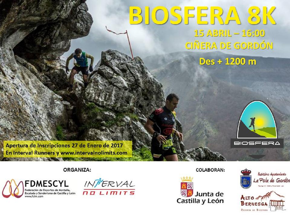 La carrera “ Biosfera 8K 2017” es una prueba organizada por la empresa Interval No Limits. Se celebrará el día 15 de Abril de 2017, con salida y meta en la localidad de Ciñera de Gordón encuadrada en la montaña central leonesa.