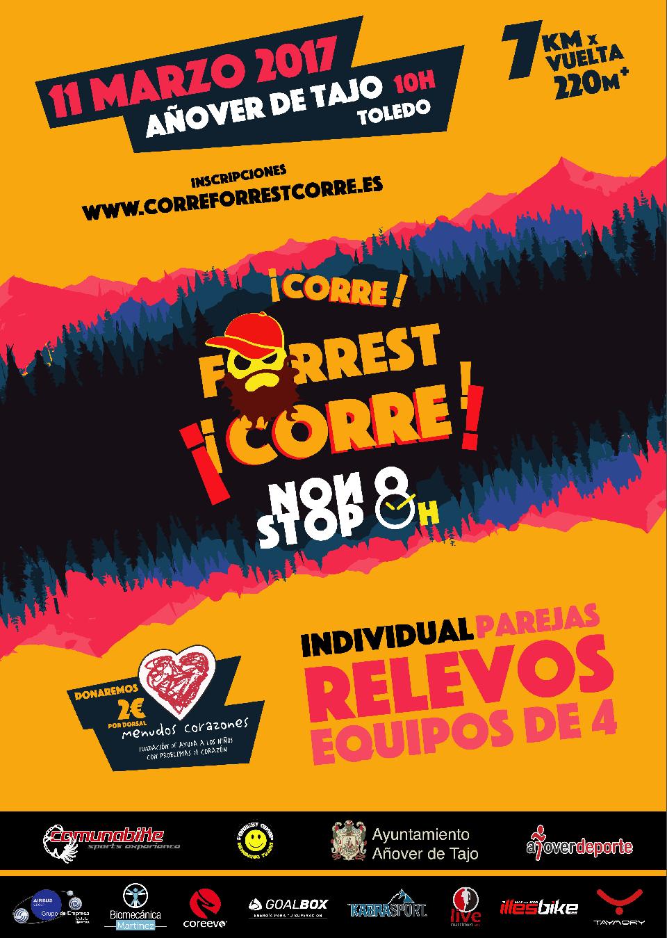 1.- la Organización: ¡¡CORRE FORREST CORRE!! es una carrera de resistencia en montaña organizada por Comunabike Sports Experience, Running Forrest Gump Team y el Ayuntamiento de Añover de Tajo (Toledo) que se celebrará el sábado 11 de marzo de 2017 y tiene un recorrido de 7km y 220m. D+ por vuelta al que los corredores deberán dar el mayor número de vueltas en las 8H que tiene de duración la carrera.