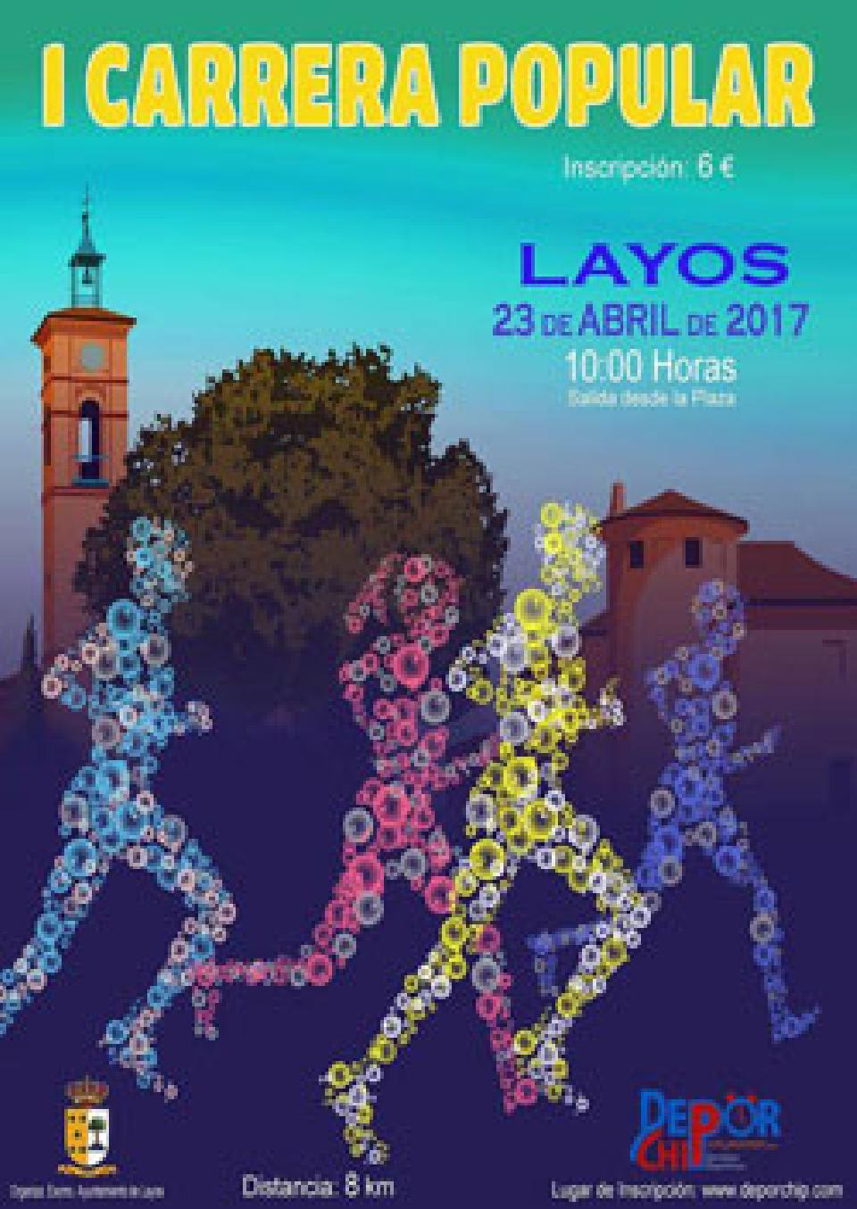 ARTÍCULO 1º.- El domingo 23 de abril de 2017, a partir de las 10:00 horas, tendrá lugar la “I CARRERA POPULAR DE LAYOS”, organizada por el Excmo. Ayuntamiento de Layos. La salida y meta estarán situadas en la Plaza del Generalísimo. La salida de la prueba absoluta, que contempla las categorías cadete, senior y veteranos, se realizará a las 11:40.