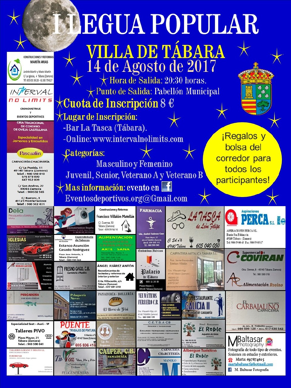 La “I Legua Popular Tábara” es una prueba organizada por el Ayuntamiento de Tábara. Se celebrará el día 14 de Agosto de 2017 a partir de las 20:30 horas.