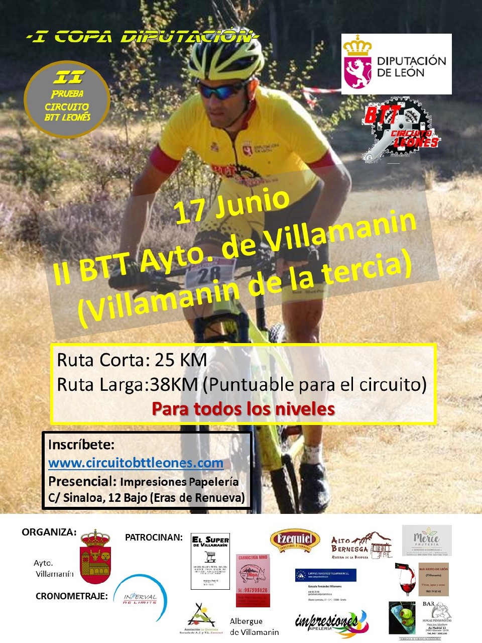 La “II BTT Ayuntamiento de Villamanin” es la 3ª de las 13 pruebas puntuables para el “II Circuito Leonés BTT-COPA DIPUTACIÓN” y tendrá lugar el próximo 17 de JuNio de 2017 a partir de las 17:00h con salida y meta en dicha localidad . Constará de DOS recorridoS circularES CON SALIDA SIMULTÁNEA. UNO de 38 kilómetros PUNTUABLE PARA EL “II Circuito Leonés BTT-COPA DIPUTACIÓN” Y OTRO DE 28 KILÓMETROS TAMBIEN CRONOMETRADO PERO NO PUNTUABLE PARA CIRCUITO.