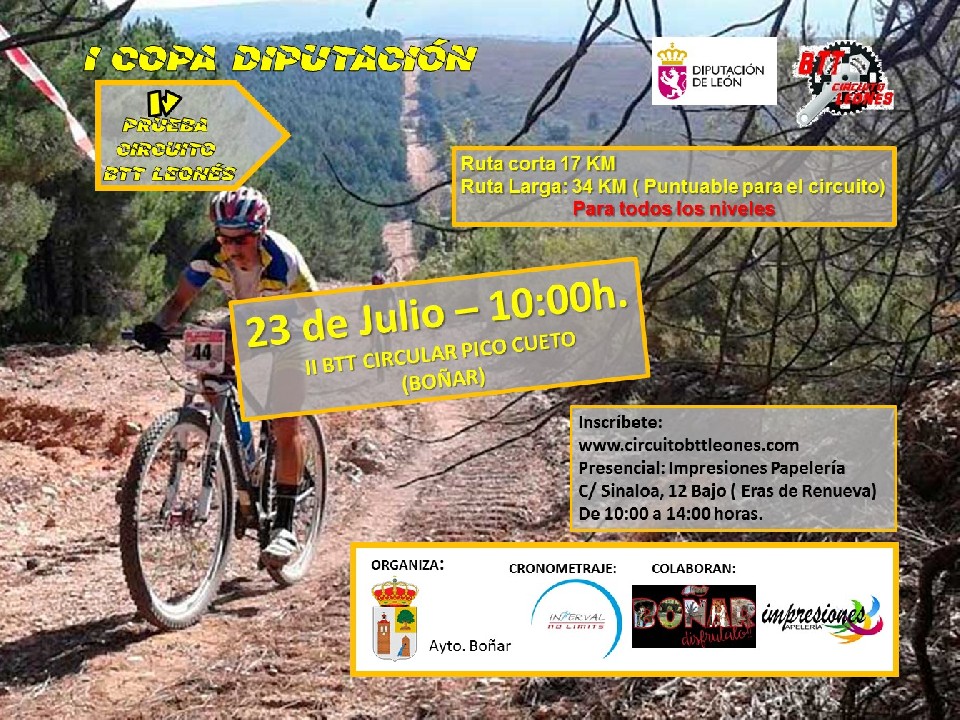 L A “ II B T T CIRCULAR PICO CUETO” E S L A 4 ª D E L A S 12 P R U E B A S P U N T U ABLES P A R A E L “ II C I R C U I T O L E O N É S B T T ” Y T E N D R Á L U G A R E L P R Ó X I M O 23 D E JULIO D E 2 0 1 7 A P A R T I R D E L A S 10:00 H C O N S A L I D A Y M E T A EN LA L O C A L I D A D DE BOÑAR . C O N S T A R Á D E U N R E C O R R I D O DE 34 KILÓMETROS PUNTUABLE PARA EL “II Circuito Leonés BTT-COPA DIPUTACIÓN” Y OTRO DE 17 KILÓMETROS TAMBIEN CRONOMETRADO PERO NO PUNTUABLE PARA CIRCUITO. C O M O S E R E F L E J A E N L O S S I G U I E N T E S A P A R T A D O S , L O S P A R T I C I P A N T E S U N A V E Z L L E G A D O S A M E T A P U N T U A R Á N C O N E L S I S T E M A Y C R I T E R I O D E P U N T U A C I Ó N M A R C A D O E N E L R E G L A M E N T O D E L “ I C I R C U I T O L E O N É S B T T ” C O M Ú N P A R A T O D A S S U S P R U E B A S , T A N T O P A R A L A S M O D A L I D A D E S “ C A T E G O R Í A S ” , “ G E N E R A L ” , “ E Q U I P O S M A S C U L I N O S ” Y “ E Q U I P O S M I X T O S ” .