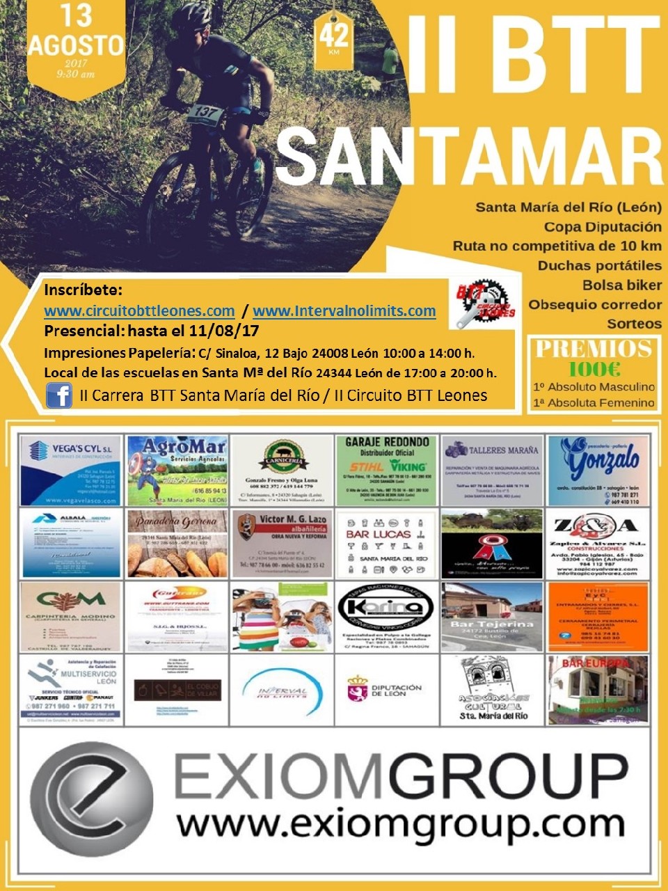 La PRUEBA “II BTT SANTAMAR” es la 6ª de las 12 pruebas EN LÍNEA puntuables para el “II Circuito Leonés BTT-COPA DIPUTACIÓN” y tendrá lugar el próximo 13 de AGOSTOio de 2017 a partir de las 10:00h con salida y meta en La localidad DE SANTA MARÍA DEL RÍO.
