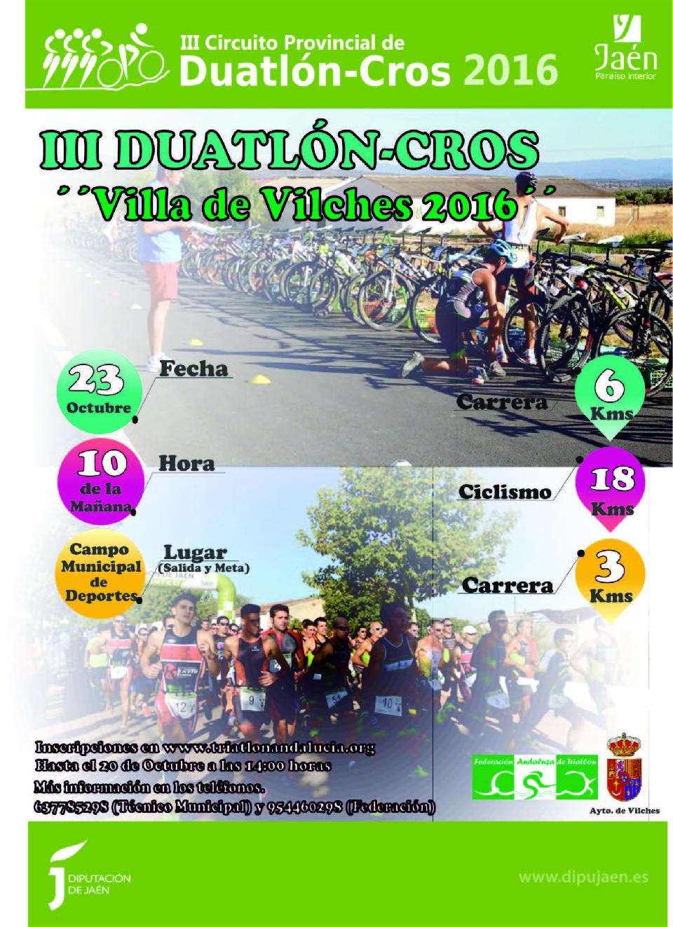 Classificacions MASCULINOS 23/10/2016 10:00 27km Veure classificacions FEMENINAS 23/10/2016 10:00 27km Veure classificacions FEDERADOS 23/10/2016 10:00 Pendent de Clas. Oficial NO FEDERADOS 23/10/2016 10:00 Pendent de Clas. Oficial Informació de contacte Contactar amb l'organitzador – 639616571 Reglament http://www.triatlonandalucia.org/competiciones/iii-duatl%C3%B3n-cros-villa-de-vilches