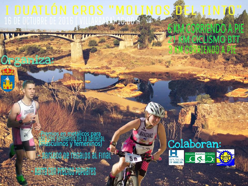 El Domingo 16 de Octubre de 2016 tendrá lugar el “I Duatlón Cros”Molinos del Tinto”. La salida tendrá lugar a las 10:00 Horas desde la Plaza España, Villarrasa (Huelva).
