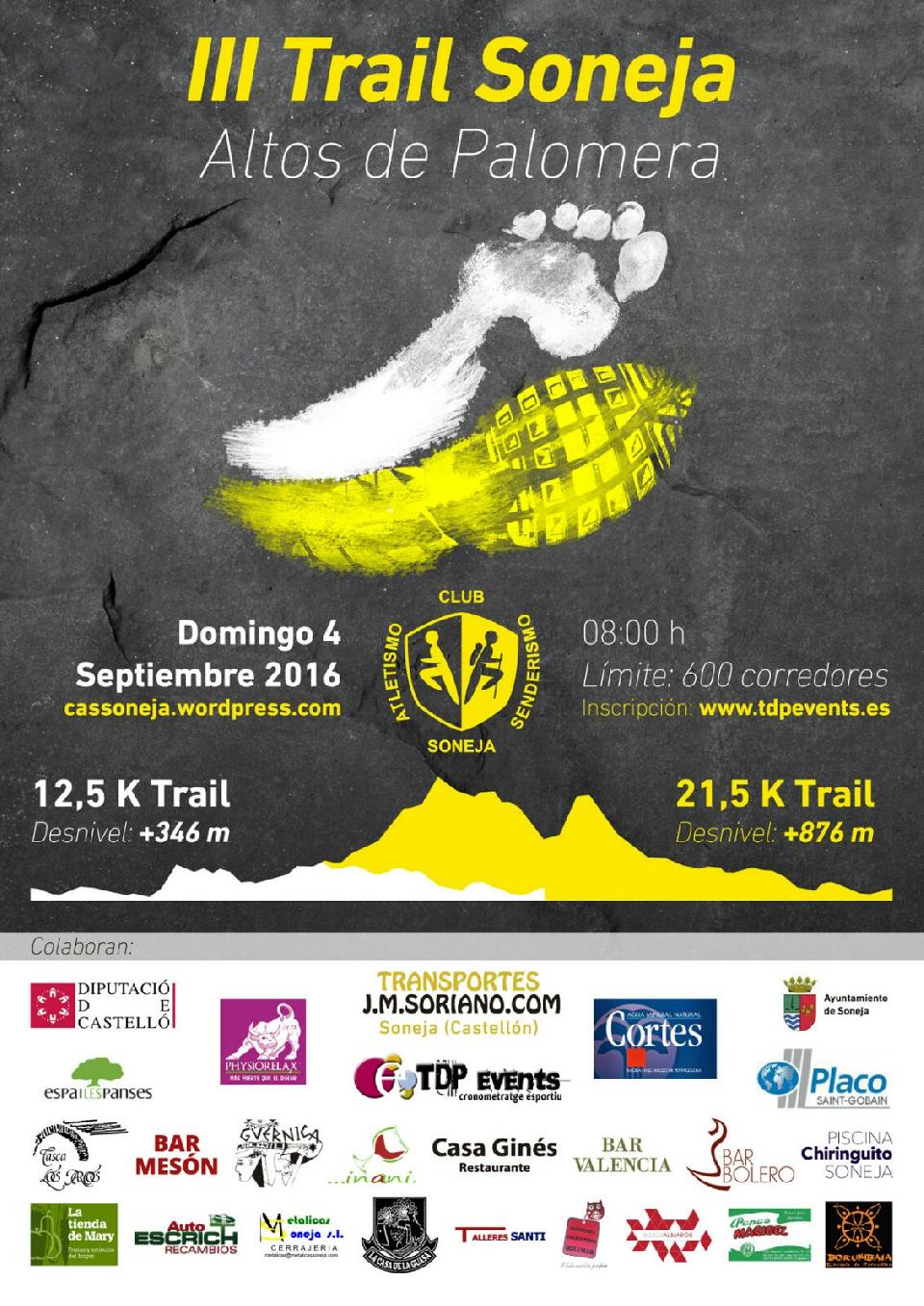 Artículo 1.- El Club de Atletismo y Senderismo de Soneja, con la colaboración del Excelentísimo Ayuntamiento de Soneja y su patrocinador oficial Transportes Soriano, organiza el III TRAIL SONEJA "ALTOS DE PALOMERA", con una distancia aproximada de 21,5 Km y un desnivel positivo de unos 876 mts y otra distancia de aproximadamente 12,5 Km y un desnivel positivo de unos 346 mts.