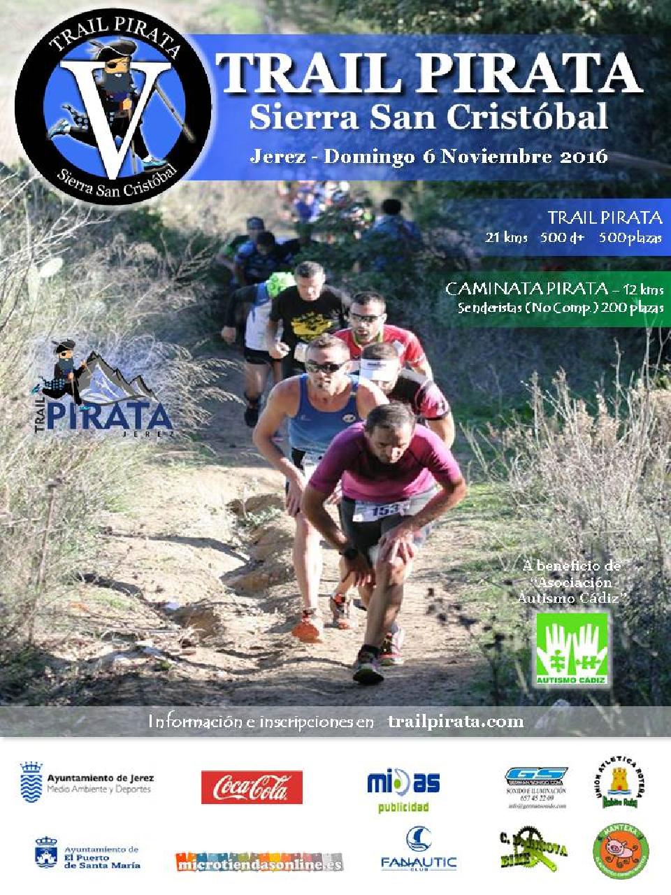 ARTÍCULO 1 El CLUB TRAIL PIRATA JEREZ organiza el V TRAIL PIRATA SIERRA SAN CRISTÓBAL, que se celebrará el 6 de noviembre de 2016. La prueba constará de dos modalidades: una Trail o carrera a pie y una senderista no competitiva, con los siguientes datos: "Trail Pirata" (carrera a pie): se desarrollará sobre un recorrido de 22 kms y un desnivel acumulado de aproximadamente 1.200 m. (620d+ y 620d-). "Caminata Pirata" (senderista no competitiva): tendrá un recorrido de 12 kms y un desnivel acumulado de aproximadamente 600 m. (300 d+ y 300 d-). En esta edición parte de lo recaudado tendrá un fin solidario, siendo a beneficio de la "Asociación Autismo Cádiz". Por cada inscripción se cederá 1 euro, además de todo lo recaudado en la barra que servirá comida y bebida en el evento, así como por otros conceptos.