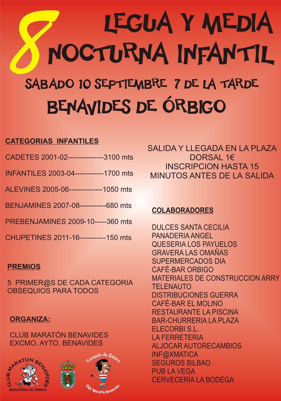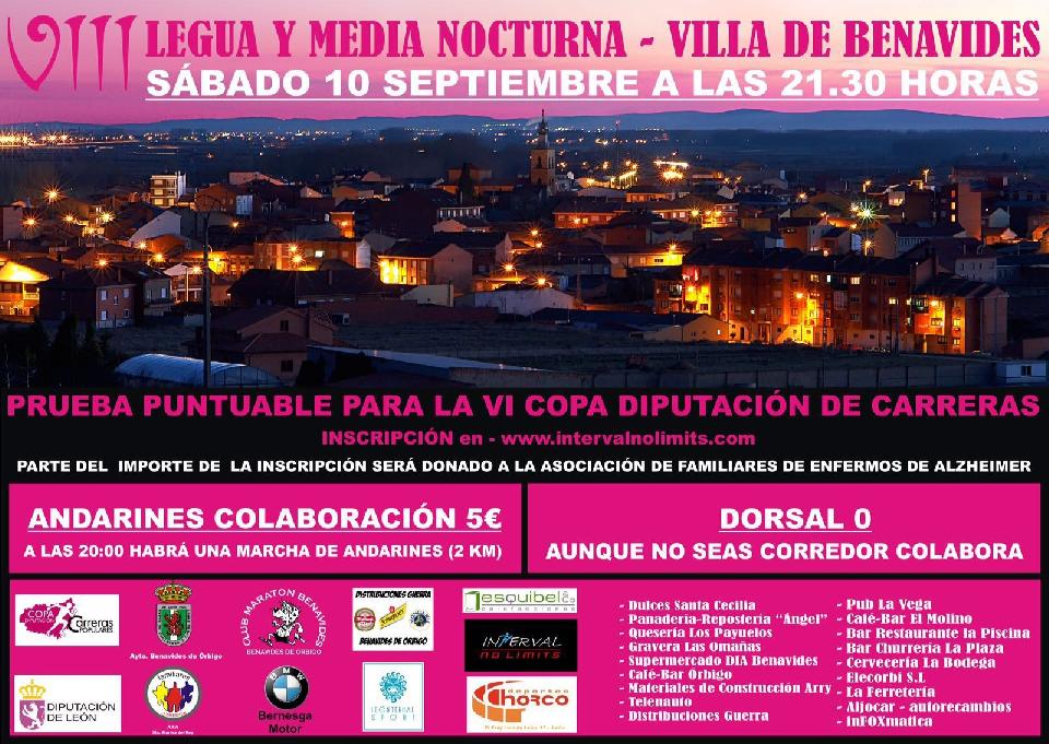 El EXCELENTÍSIMO AYUNTAMIENTO DE BENAVIDES DE ÓRBIGO EN COLABORACIÓN CON EL CLUB MARATON BENAVIDES organiza la VIII LEGUA Y MEDIA NOCTURNA DE BENAVIDES, INSCRITA EN LA VI COPA DE CARREAS POPULARES DE LA DIPUTACIÓN DE LEÓN.