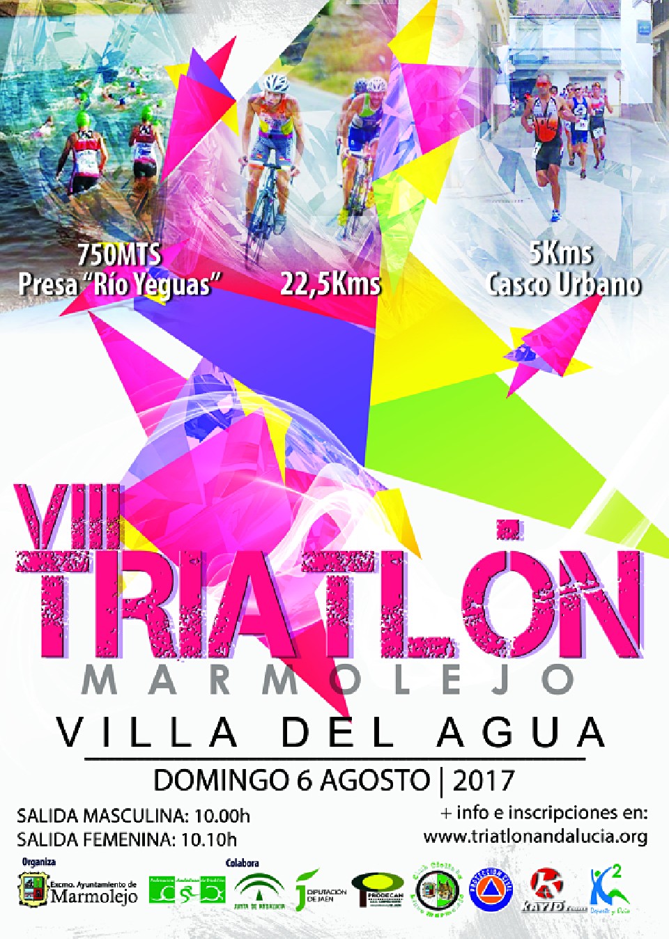 Classificacions MASCULINOS 06/08/2017 10:00 28.25km Veure classificacions FEMENINAS 06/08/2017 10:05 28.25km Veure classificacions FEDERADOS 06/08/2017 10:00 28.25km Pendent de Clas. Oficial NO FEDERADOS 06/08/2017 10:00 Pendent de Clas. Oficial CADETES FEDERADOS 06/08/2017 10:00 Pendent de Clas. Oficial CADETES NO FEDERADOS 06/08/2017 10:00 Pendent de Clas. Oficial Informació de contacte Contactar amb l'organitzador – 639616571 Reglament http://www.triatlonandalucia.org/competiciones/viii-triatl%C3%B3n-villa-del-agua