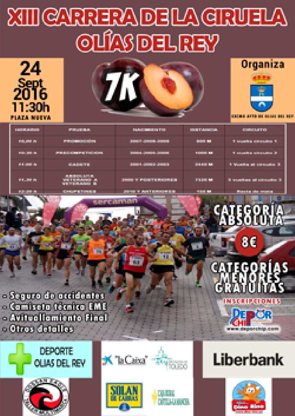 ARTÍCULO 1º.- El sábado 24 de Septiembre de 2016, a partir de las 10:00 horas, tendrá lugar la “XIII CARRERA DE LA CIRUELA – OLÍAS DEL REY”, organizada por el Excmo. Ayuntamiento de Olías del Rey, la cual incluye las categorías de Chupetín, Promoción, Pre competición, cadete, sénior, veterano A y veterano B tanto para masculino como para femenino