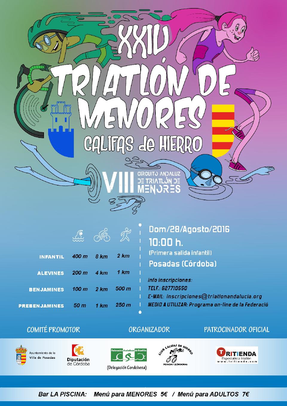 28/08/16 1. ENTIDAD ORGANIZADORA DELEGACIÓN CORDOBESA DE TRIATLÓN Y C.T.CALIFAS DE HIERRO Teléfonos 667479594 Correo electrónico cordoba.fatriatlon@gmail.com Nombre de la persona responsable Rafael Moreno (Delegado provincial) Entidad Colaboradora Ayuntamiento de Posadas, Diputación de Córdoba.
