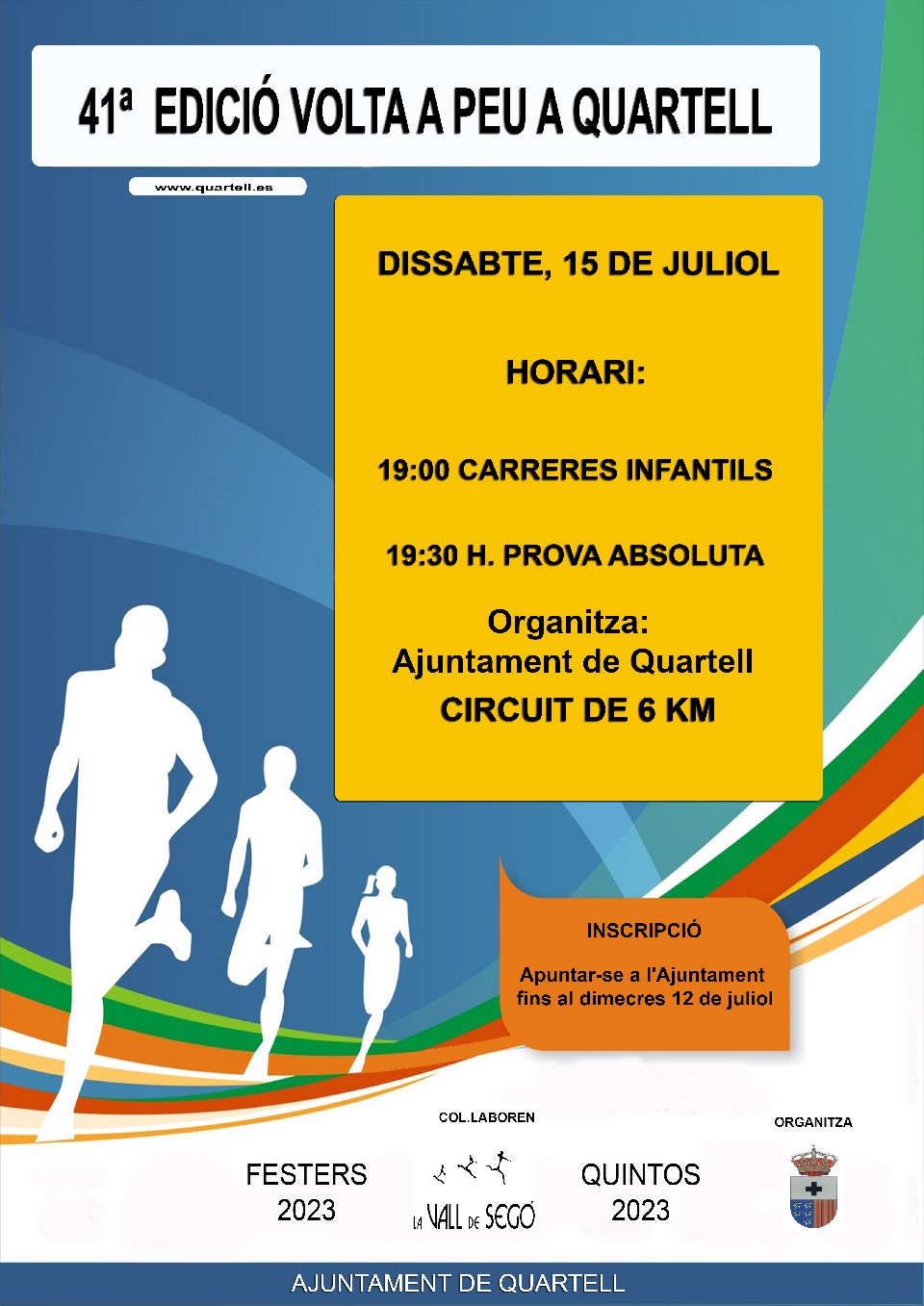 Art. 1) La Regidoria d´Esports de l´Ajuntament de Quartell organitza la 41ª Volta a Peu a Quartell amb la col·laboració del Club Atletisme La Vall de Segó, els Festers de 2023 i altres comerços locals. Enguany la Volta a peu a Quartell forma part del III Circuit de Carreres Populars “CRONOMETRA” Camp de Morvedre