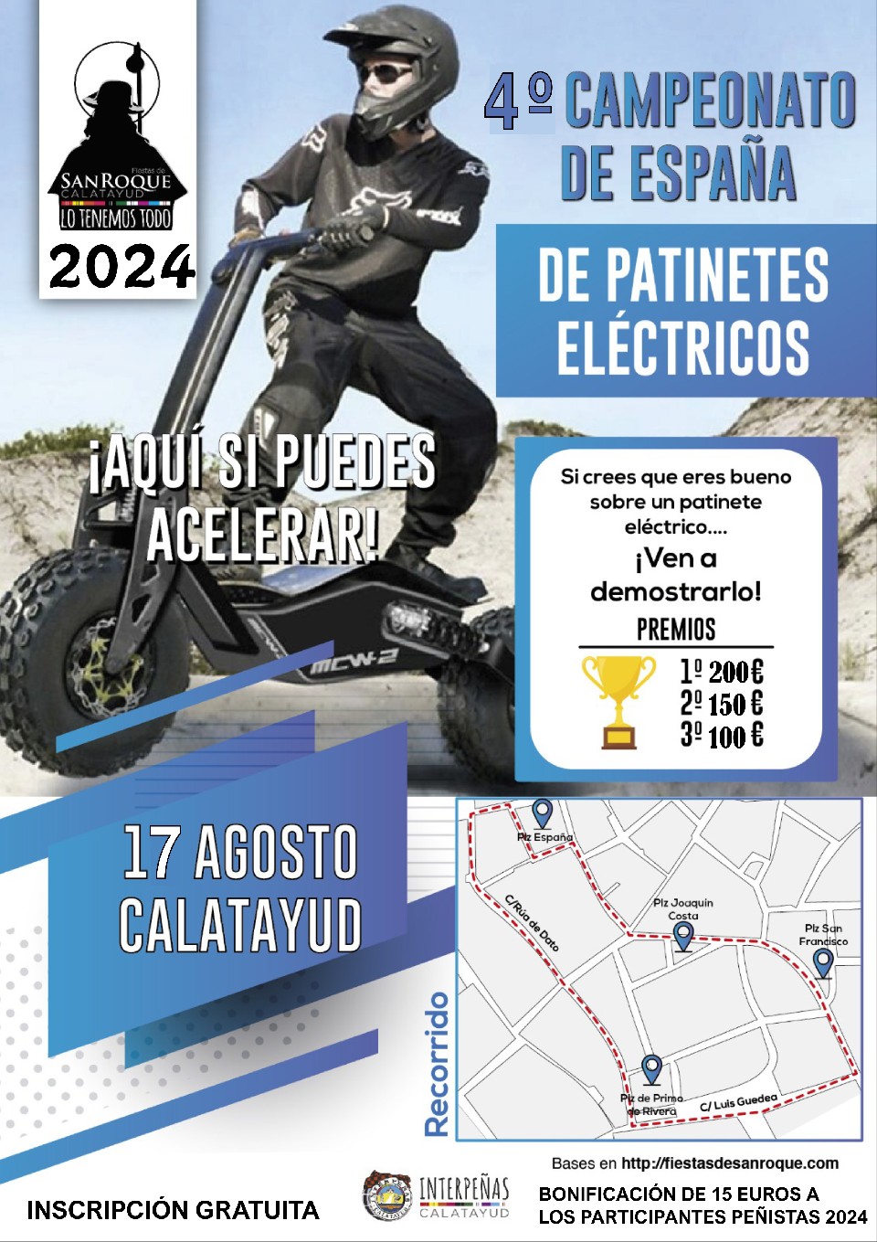 Esta competición, consiste básicamente en realizar un recorrido por un circuito urbano de 800mts en la ciudad de Calatayud, utilizando un patinete / scooter eléctrico.