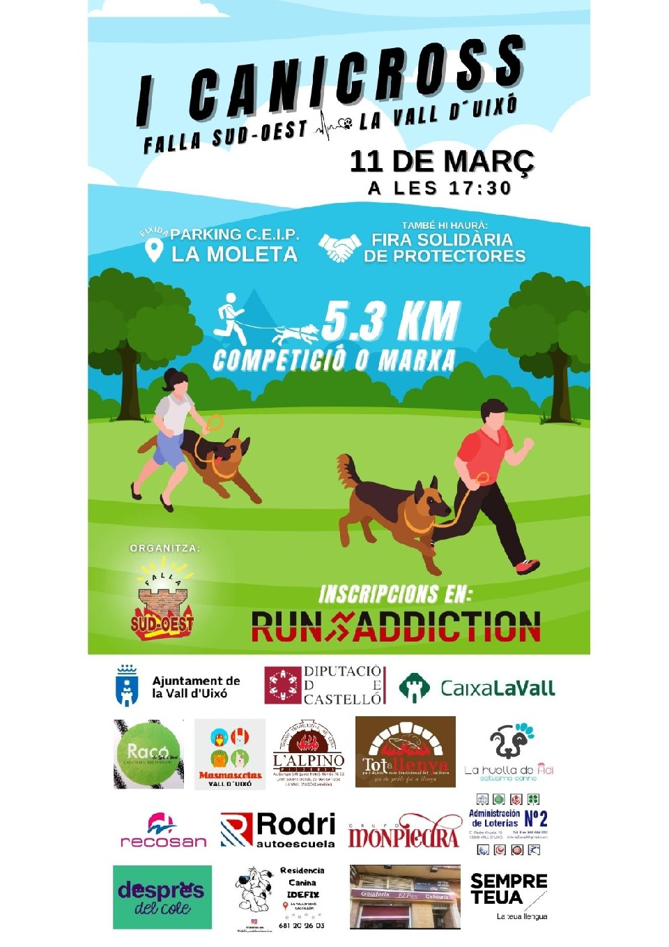 ÍNDEX 1 REGLAMENT 1. Recorregut 2 2. Eixida 3 3. Categories 3 4. Classificacions i premis 4 5. Requisits participants 5 6. Requisits gossos 6 7. Control veterinari 6 8. Control gossos 7 9. Sistema d’ancoratge 7 10. Causes de no participació 7 11. Causes de desqualificació 8 12. Preus inscripcions 9 13. Carta expressa d'exempció 10 14. Document autorització a menors 11 1. RECORREGUT 2 1.1. Els recorreguts estaran degudament senyalitzats en la seva totalitat, amb cintes o fletxes. Es tindrà cura en fer un marcatge especial en els punts conflictius com els encreuaments. Sempre que sigui necessari, l’organització ficarà tantes persones com facin falta en aquests punts i d’altres, com els controls de pas, per a garantir el bon funcionament de la cursa, el compliment del reglament i per orientar els corredors. 1.2. Els recorregut de la cursa serà d’entre un mínim de 4 km i un màxim de 6.5 km. 1.3. Durant el recorregut cap la possibilitat de situar controls d’avituallaments els cuals seran ECOFRIENDLY (cadascun haurà de portar la seua botella per a emplenar-la). En cas afirmatiu aquests s'anunciaran en el díptic de la prova, i estaran a una distància que no serà superior als 2 km entre ells, així com en finalitzar la prova. Aquests avituallaments disposaran com a mínim d’aigua (2 poals d’aigua per als gossos i garrafes per als corredors/res). 1.4. La cursa transcorrerà principalment per pistes, limitant els trams d’asfalt i corriols, com a màxim sent el 50% del total del recorregut, ja que son superfícies abrasives. 1.5. La prova no es cancel·laran en cas de pluja, tret de condicions extremes com pugui ser una tronada, nevada o temperatures massa elevades (+ de 30º en el moment d’inici de la cursa ). 3 2.1. En l'eixida es diferenciarà les tres categories que té la prova: masculina, femenina i marxa. 2.2. Es donarà primer l'eixida als participants de la categoria Masculina. Transcorregut 3 minuts, es donarà l'eixida a les participants de la categoria Femenina, i als 3 minuts de la eixida femenina, es donarà l'eixida a la marxa. 2.3. L’organització es reserva el dret a realitzar canvis en la mateixa, si hi ha algun factor que impedeix desenvolupar-la amb normalitat. 3. CATEGORIES 3.1. Les categories, tant femenines com masculines, que s'estableixen en aquesta carrera són les següents: 1 NO COMPETITIVA/MARXA ----------- ------------- 1b Acompañante no competitivo ----------- ------------- 2 JUNIOR: FINS ALS 17 ANYS MASCULINA FEMENINA 3 SÈNIOR: DELS 18 ALS 39 ANYS MASCULINA FEMENINA 4 VETERANA: MÉS DE 40 ANYS MASCULINA FEMENINA 3.2. L’edat que delimita cadascuna de les categories fa referència a l’edat que tindrà el/la participant en el moment de la inscripció. 3.3. La prova no competitiva consisteix a participar en la carrera podent fer-ho caminant, sense dret a trofeu, però si a assegurança i borsa del corredor. Existeix la possibilitat que en cas que només es tinga un gos amb el qual córrer i es vulga acompanyar al seu guia en la carrera, es podrà inscriure com a acompanyant, portant el mateix dorsal que el corredor. Sense dret a borsa del corredor ni a cronometratge, però si a assegurança i avituallament. 4 4.1. Hi haurà classificacions de les subcategories júnior, sènior i veterà. 4.2. Trofeus i regals per als tres primers de les classificacions tant de la categoria masculina com femenina i de cadascuna de les subcategories júnior, sènior i veterà. 5. REQUISITS PARTICIPANTS 5.1. El nombre de participants queda limitat a 1 5 0 corredors per categoria. La reserva de les places es farà per rigorós ordre de lliurament d'inscripció. 5.2. Els menors d’edat podran córrer amb una autorització firmada pel pare/mare/tutor/tutora (segons model, annex). 5.3. L'organització no es fa responsable dels danys personals i/o materials que puguin ocasionar els participants en la prova. 6. REQUISITS GOSSOS 5 6.1. Tenir 12 mesos com a mínim i 10 anys, com a màxim. En marxa no hi haurà límit d'edat per als gossos. 6.2. Tenir la Cartilla de Vacunació al dia segellada per Veterinari/a col·legiat/da. 6.3. Tenir el Microxip implantat. 6.4. Portar posat en tot moment morrió/bossal (tipus cistella) en cas de "races perilloses" (o en cas d'animals agressius o especialment nerviosos). 7. CONTROL VETERINARI 7.1. El participant s’haurà de presentar al punt veterinari situat en l'espai de sortida per a poder passar el control. Haurà de presentar-se amb el gos i la cartilla de les vacunes actualitzada i signada pel seu veterinari/a habitual. 7.2. Les vacunes obligatòries són: Antiràbica. Polivalent (parvovirosis, leptospirosis, moquillo canino i hepatitis canina, com a mínim). 7.3. S’obrirà als participants almenys 1 hora abans de l’inici de la cursa i participarà com a mínim un veterinari. 7.4. Durant el control el veterinari/a haurà de verificar el bon estat de salut del gos i la seua aptitud per a la prova. 8. CONTROL GOSSOS 6 8.1. El corredor/a serà responsable del seu gos en tot moment, des de l’arribada al lloc de la cursa fins que marxi. 8.2. No es permeten gossos sense lligar ni abans, ni durant, ni després de la cursa. 8.3. Així mateix, també es responsabilitza de les deixalles que pugui fer el seu gos. Hi haurà cubells habilitats per llençar-les. 9. SISTEMA D'ANCORATGE 9.1. És obligatori que els gossos porten un arnés de tir específic i anar units al corredor per una línia de tir que no superi els 2'5m en extensió. 9.2. És obligatori que els corredors porten un cinturó d'uns 7cms d'ample com a mínim, on pugui enganxar la línia de tir mitjançant un sistema d'obertura ràpida. 9.3. En la prova de marxa podran portar als gossos subjectes amb corretja, sense necessitat de portar l'arnes de carrera. 10.CAUSES DE NO PARTICIPACIÓ 10.1. No complir en algun dels requisits exigits per als gossos. 10.2. Per recomanació del veterinari. 10.3. Sols existeix l'excepció de poder-hi participar entregant la cart