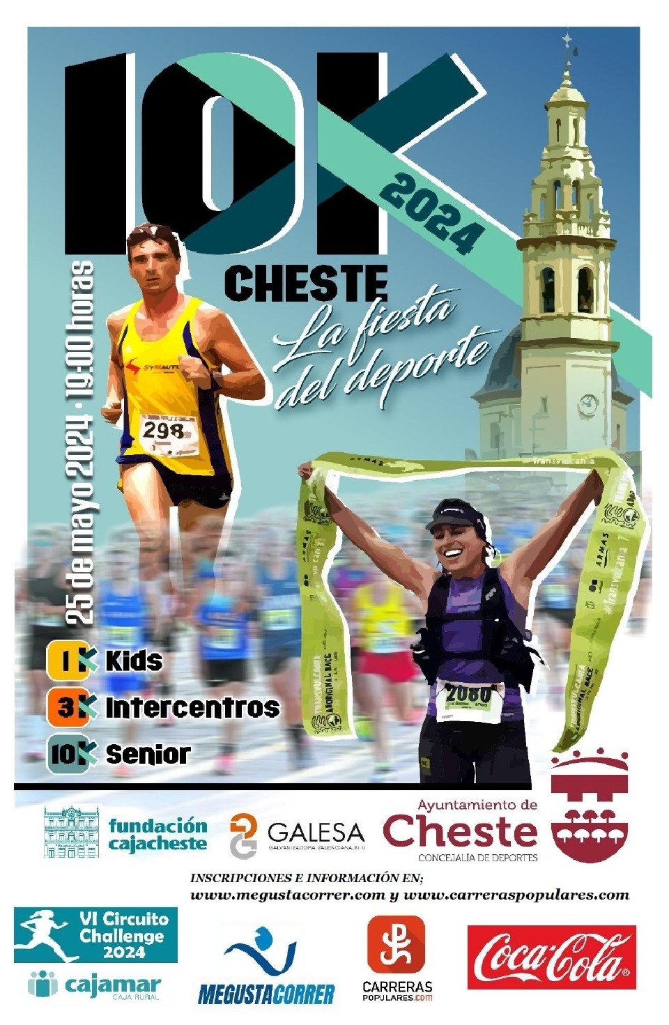 ART. 1- La Concejalía de Deportes del Ayto. De Cheste junto con Galesa y la Fundación Caja Rural de Cheste, organizan la CARRERA POPULAR 10K. Prueba en la que puede participar cualquier persona sin distinción de sexo o nacionalidad. Con las limitaciones que establece la R.F.E.A. para carreras de ámbito autonómico. Queda prohibida la participación de menores de 11 años en la prueba de 3k., y de 18 años en la prueba de 10k., estableciéndose diferentes categorías por edad. La prueba reina será puntuable para la VI Challenge Cajamar 2024.