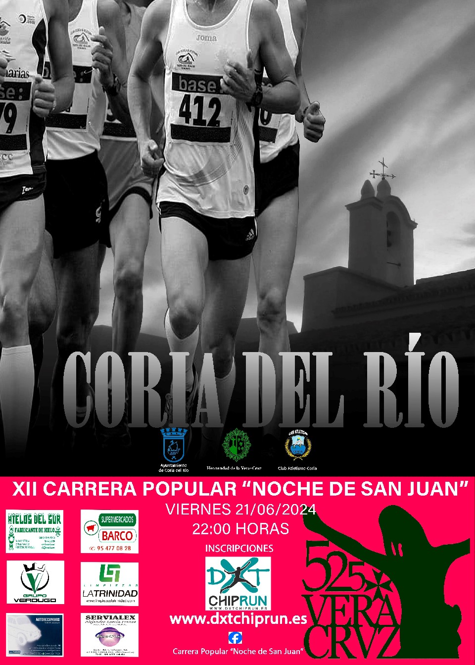 XII CARRERA POPULAR “NOCHE DE SAN JUAN” La Hermandad de la Vera Cruz de Coria del Río, con la colaboración del Club Atletismo Coria, el Excmo. Ayuntamiento de Coria del Rio y empresas de la localidad, organizan la XII Carrera Popular “Noche de San Juan”, que tendrá lugar el viernes 21 de junio de 2024 a las 22:00h BASES-REGLAMENTO 1.- La prueba dará comienzo a partir de las 22:00h para las categorías y orden siguiente: Orden Categoría Año de nacimiento Distancia 1º JUNIOR-PROMESAS 2001-2005 5.000 metros 1º SENIOR 1988-2000 5.000 metros 1º VETERANO A 1978-1987 5.000 metros 1º VETERANO B 1977 y anterior 5.000 metros De cara a la entrega de premios, se entenderá por categoría Absoluta a la formada por la totalidad de los participantes realizándose distinción por sexo. 2.- Todoslos participantes en la carrera deberán abonar una CUOTA DE INSCRIPCIÓN SOLIDARIA DE 7 EUROS. 3.- Las inscripciones podrán efectuarse hasta el 20 de junio de 2024 de la siguiente forma, detallándose los datos mínimos requeridos: De forma Telemática: 1.- A través de la página web de www.dxtchiprun.es Pinchando en el cartel de la carrera y siguiendo las instrucciones de inscripción de la plataforma. De forma Presencial 2.-JAYRO-SPORT, c/. Antonio Casado, 2. Coria del Río 3.- CLUB ATLETISMO CORIA. (www.clubatletismocoria.org) 4.- CENTRO DE ESTUDIOS FORMA-T², Avda. 1º Mayo, 35. Coria del Rio 5.- ELECTRODOMÉSTICOS ROMA, Calle Cantalobos, 20. Coria del Rio 6.- GIMNASIO HIDALGO, P.I. La Estrella, Coria del Río 7.- KORA BOX, C/Mimbre, Nave 8, Coria del Río 8.- SALVAJE, C/Carpintero, 21, P.I. La Estrella, Coria del Río 9.- OFICINA DE TURISMO, planta baja del Ayuntamiento 4.- La salida tendrá lugar en AVENIDA 1º DE MAYO 5.- Los dorsales podrán retirarse entre las 19:00h y las 21:00h, en las dependencias del Ayuntamiento de Coria del Rio, el mismo día de la carrera entregando el justificante correspondiente y presentando el DNI. 6.- El recorrido es el siguiente: Salida en Avda. 1º Mayo, Avda. 1º Mayo hasta Calle Tajo, bajada por Gran Avenida (cuesta piscina), calle Cartagineses, calle Vespasiano, Vía Servicio hasta Nissan, cruza ctra. Coria-Sevilla, Paseo Fluvial hasta Grupo Obrero, Calle Caridad, Calle Betis, Calle Dr. Fleming, Paseo Carlos de Mesa, Paseo Martínez de León, Calle Martínez de León, Plaza Sagunto, Calle Méndez Núñez, Calle San Juan hasta la Cruz de la Ermita subiendo los escalones. Meta: en la misma cruz de la ermita de San Juan Bautista, junto a la Capilla, subiendo sus 33 escalones. El recorrido irá escoltado y auxiliado por los miembros de la ASOCIACIÓN CICLOTURISTA CORIA DEL RIO 7.- La organización no se responsabiliza de los corredores/as que participen sin contar con la edad reglamentaria, o que lo hagan sin dorsal, no admitiéndose inscripción alguna sin las edades correctas. 8.- Durante la celebración de la prueba se dispondrá de los Servicios Sanitarios necesarios. 9.- La Organización no se hace responsable de los daños que pudieran causar o causarse los atletas participantes por imprudencias o negligencias de los mismos. Igualmente, el atleta declara estar en condiciones físicas óptimas para realizar esta prueba y lo hace bajo su responsabilidad, eximiendo a la Organización de la Prueba de la misma. El inscribirse en esta prueba supone la aceptación plena de estas normas. 10.- Toda persona que corra sin estar debidamente inscrita lo hace bajo su responsabilidad. 11.- Los participantes deberán estar media hora antes del comienzo de su prueba en la zona de salida. 12.- Quedarán descalificados: - Todo corredor/a con categoría o edad falseada, cambio de dorsal, etc. - Aquellos corredores que no lleven el dorsal bien visible o no realicen el recorrido completo. - Todo aquel que reciba ayuda durante el recorrido o corra acompañado durante su prueba. 13.- Los únicos vehículos que podrán seguir la prueba serán los expresamente autorizados por la Organización. 14.- Las reclamaciones serán atendidas por la Organización y los Jueces de la prueba, siendo sus decisiones inapelables. 15.- Todos los participantes inscritos, por el mismo hecho, aceptan el presente Reglamento, prevaleciendo el criterio de la Organización en caso de dudas. 16.- TROFEOS Y PREMIOS: - - Cheque regalo ofrecido por la Asociación de Comerciantes “EL ZOCO” de Coria del Río al primer corredor y corredora en entrar en meta, ganadores por tanto en categoría absoluta masculina y femenina. -Magnífico trofeo conmemorativo, a los tres primeros clasificados de cada categoría en las modalidades masculina y femenina. Este trofeo no será acumulable con el de clasificado hermano o hermana de la Vera Cruz. Prevalecerá la entrega del trofeo por categoría ante el de hermano o hermana de la Vera Cruz en caso de coincidir en la misma persona. -Magnifico trofeo conmemorativo al primero clasificado hermano y primera clasificada hermana de la Vera Cruz. En caso de haber obtenido trofeo por categoría, este premio se entregará al siguiente clasificado hermano o hermana de la Vera Cruz. -Trofeo al corredor o corredora de mayor edad en cruzar la línea de meta. -Trofeo al club con mayor número de participantes entrados en meta. -Detalle conmemorativo de la prueba a los 100 PRIMEROS ATLETAS que entren en meta independientemente de su categoría. Los premios y trofeos se entregarán una vez confeccionadas las listas definitivas de ganadores. Al finalizar la carrera y posterior entrega del dorsal, se obsequiará a todos los participantes con una gran bolsa del corredor con camiseta conmemorativa de recuerdo y un vale de consumición. Existirá servicio de guardarropa para el uso de los corredores que lo deseen, podrán dejar sus pertenencias junto a la mesa de retirada de dorsales y recogerlas en la pista del colegio Cerro de San Juan, junto a la meta. Una vez finalizada la última prueba se invita a todos los participantes a disfrutar de un rato agradable en la “Velada Hermandad
