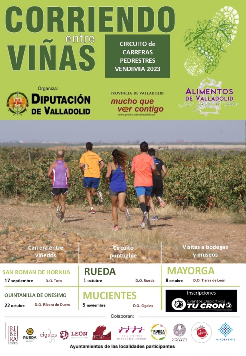 CIRCUITO CORRIENDO ENTREVIÑAS 2023” REGLAMENTO PÁGINA 1 1.- ORGANIZACIÓN. - Actividad organizada por la Diputación de Valladolid, a través de su Servicio de Deportes. La actividad consiste en la celebración de cinco carreras pedestres por las distintas Denominaciones de Origen que hay en la Provincia de Valladolid 2.- PARTICIPANTES. - Podrán participar todos los aficionados y aficionadas al atletismo estén o no federados siempre que hayan nacido en el año 2006 o anteriores. Habrá un circuito de carreras de promoción en el que podrán participar todos los niños y niñas nacidos desde el año 2007 en adelante. 3.- CATEGORIAS. - SUB 18. – nacidos en 2005 Y 2006 SENIOR. - nacidos en 2004 a 1990 MASTER A.- nacidos en 1989 a 1984 MASTER B.- nacidos en 1983 a 1979 MASTER C.- nacidos en 1978 a 1974 MASTER D.- nacidos en 1973 a 1969 MASTER E.- nacidos en 1968 a 1964 MASTER F.- nacidos en 1963 a 1958 MASTER G.- nacidos en 1957 y anteriores Categorías de promoción. - SUB 16 2007 – 2008 SUB-14 2009 – 2010 SUB-12 2011 – 2012 SUB-10 2013 – 2014 SUB-8 2015 – 2016 (no competitivas) SUB-6 2017 (no competitivas) Chupetines 2018 en adelante (No competitivas) REGLAMENTO “CIRCUITO CORRIENDO ENTREVIÑAS 2023” REGLAMENTO PÁGINA 2 Todas las categorías masculinas y femeninas. 4.- INSCRIPCION. - Inscripción individual. - La inscripción de los atletas se hará según las fechas de nacimiento establecidas para las categorías enunciadas. Se hará para cada prueba, por lo que el dorsal será diferente en cada prueba tanto para los participantes adultos como en las categorías de promoción. Inscripción por equipos. - Los equipos estarán formados por un mínimo de cuatro atletas y un máximo de ocho todos del mismo sexo. Los equipos estarán formados por atletas todos ellos con licencia por el mismo club federado o socios todos ellos de la misma asociación. Se podrán inscribir tantos equipos del mismo club como se desee diferenciándolos con letras mayúsculas. Equipo A, B, etc. La formación de equipos se comunicará por correo electrónico solicitando el formulario de inscripción en Contacta con nosotros - CORRIENDO ENTREVIÑAS SAN ROMÁN DE HORNIJA (tucrono.com), y solo se admitirá hasta el fin del plazo de inscripción de la 1ª carrera. Como hacer la inscripción. - a) - A través de la página Web: https://inscripciones.tucrono.com/inscripcion/corriendo-entrevinas-sanroman-de-hornija/inscripcion_datos/ El plazo de inscripción para cada prueba finaliza el jueves anterior a la misma a las 15:00h. b). - No se realizarán inscripciones el día de la carrera c). - La inscripción es totalmente gratuita para todas las carreras. d). - Se consideran corredores locales todos los empadronados en la localidad el día de la prueba, es obligatorio indicarlo en la inscripción. (Premios no acumulables excepto locales) REGLAMENTO “CIRCUITO CORRIENDO ENTREVIÑAS 2023” REGLAMENTO PÁGINA 3 5.- DIAS Y LUGARES DE CELEBRACION. - 1ª carrera 17 de septiembre: SAN ROMÁN DE HORNIJA 2ª carrera 1 de octubre: RUEDA 3ª carrera 8 de octubre: MAYORGA 4ª carrera 22 de octubre: QUINTANILLA DE ONÉSIMO 5ª carrera 5 de noviembre: MUCIENTES Los días y lugares podrán ser modificados por la organización comunicándose con suficiente antelación 6.- HORARIO. - Todas las pruebas darán comienzo a las 11.00 horas de la mañana. Una vez terminada la carrera de las categorías adultas, comenzarán las carreras de promoción y al término de estas será la entrega de trofeos. 7.- DORSALES. - Será recogido en el lugar de salida de cada prueba a partir de las 10:00 horas y hasta quince minutos antes del inicio de la carrera. 8.- CLASIFICACION. - En cada carrera: Adultos - Campeón/a, subcampeón/a y tercero/a clasificado/a de la general. - Campeón/a de cada categoría adulta - Campeón/a, subcampeón/a y tercero/a clasificado/a de los locales. Niños: - Campeón, Subcampeón y tercer clasificado y Campeona, Subcampeona y tercera clasificada de las cuatro categorías competitivas. Clasificación final del Circuito “Corriendo entre Viñas” 2023: Campeón/a, subcampeón/a y tercero/a clasificado/a de la general de las cinco carreras. Estos campeones serán los atletas que mejores resultados hayan conseguido sumando cuatro pruebas teniendo en cuenta la posición de la clasificación general. REGLAMENTO “CIRCUITO CORRIENDO ENTREVIÑAS 2023” REGLAMENTO PÁGINA 4 Campeón/a, subcampeón/a y tercero/a clasificado/a de cada una de las categorías. Contabilizando los mejores resultados de cuatro pruebas, teniendo en cuenta la posición por categoría. Equipo campeón con más participación masculina del Circuito “Corriendo ente Viñas” 2023. Para calcular estos equipos campeones deberán finalizar cuatro carreras cuatro componentes del mismo equipo como mínimo, se tomarán los tiempos de la clasificación general. Equipo campeón con más participación femenina del Circuito “Corriendo ente Viñas” 2023. Para calcular estos equipos campeones deberán finalizar cuatro carreras cuatro componentes del mismo equipo como mínimo, se tomarán los tiempos de la clasificación general. Equipo campeón con más participación de categorías de promoción del Circuito “Corriendo ente Viñas” 2023. Para calcular estos equipos campeones deberán finalizar cuatro carreras cuatro componentes del mismo equipo como mínimo, se tomarán los tiempos de la clasificación general. Para todas las clasificaciones del Circuito: se tomará la puntuación de cuatro pruebas como mínimo, si se ha participado en 5 se eliminará la peor puntuación. Incluidas carreras de promoción. 9.- PREMIOS. - En cada carrera: Adultos (BOTELLAS DE VINO DE LAS BODEGAS D.O) - Campeón/a, subcampeón/a y tercero/a clasificado/a de la general. - Campeón y Campeona de cada una de las categorías. - Campeón/a, subcampeón/a y tercero/a clasificado/a local de cada prueba. Niños: - A los tres primeros/as de cada categoría masculin