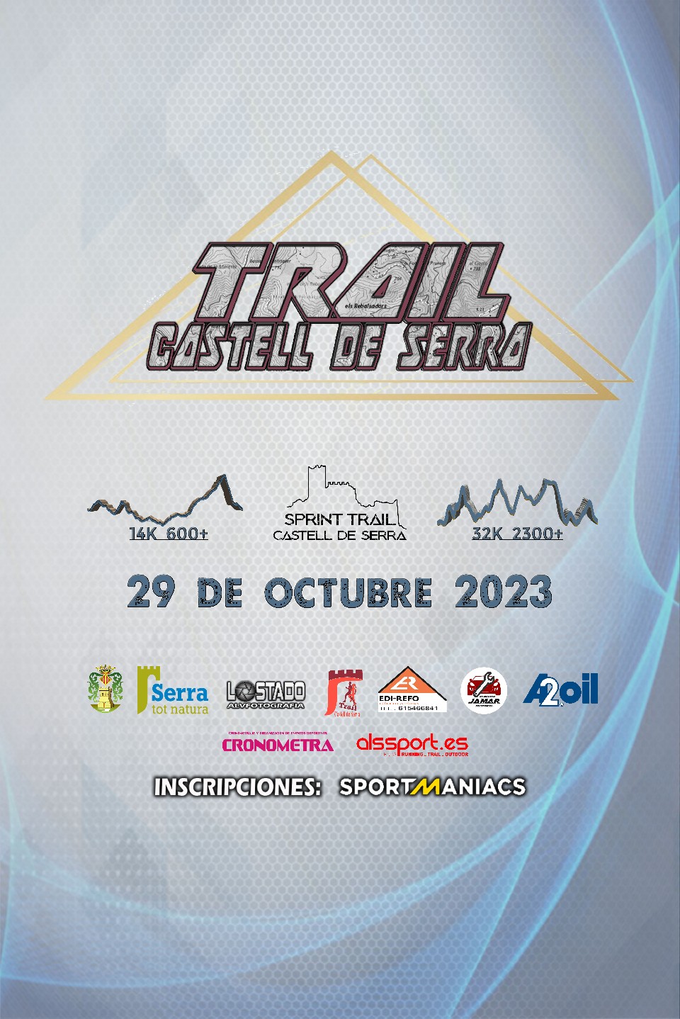 - Inscripción: Las inscripciones se formularán a través de la web de SPORTMANIACS web: www.sportmaniacs.com dentro del plazo establecido desde el 21 de mayo hasta el 22 de octubre del 2023. El importe será de 35€ para el Trail Castell de Serra 2023 y de 20€ para el Sprint Trail Castell de Serra 2023.
