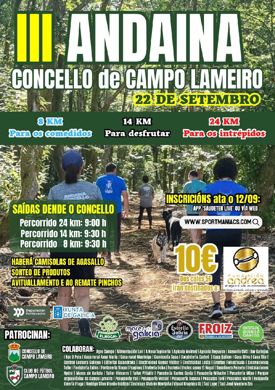 Deste prezo, a organizacion da andaina comprométese a colaborar coa Fundación Andrea con 5€ por participante. Habilitarase unha fila cero para calquera persoa que queira facer a súa achega a favor desta causa.