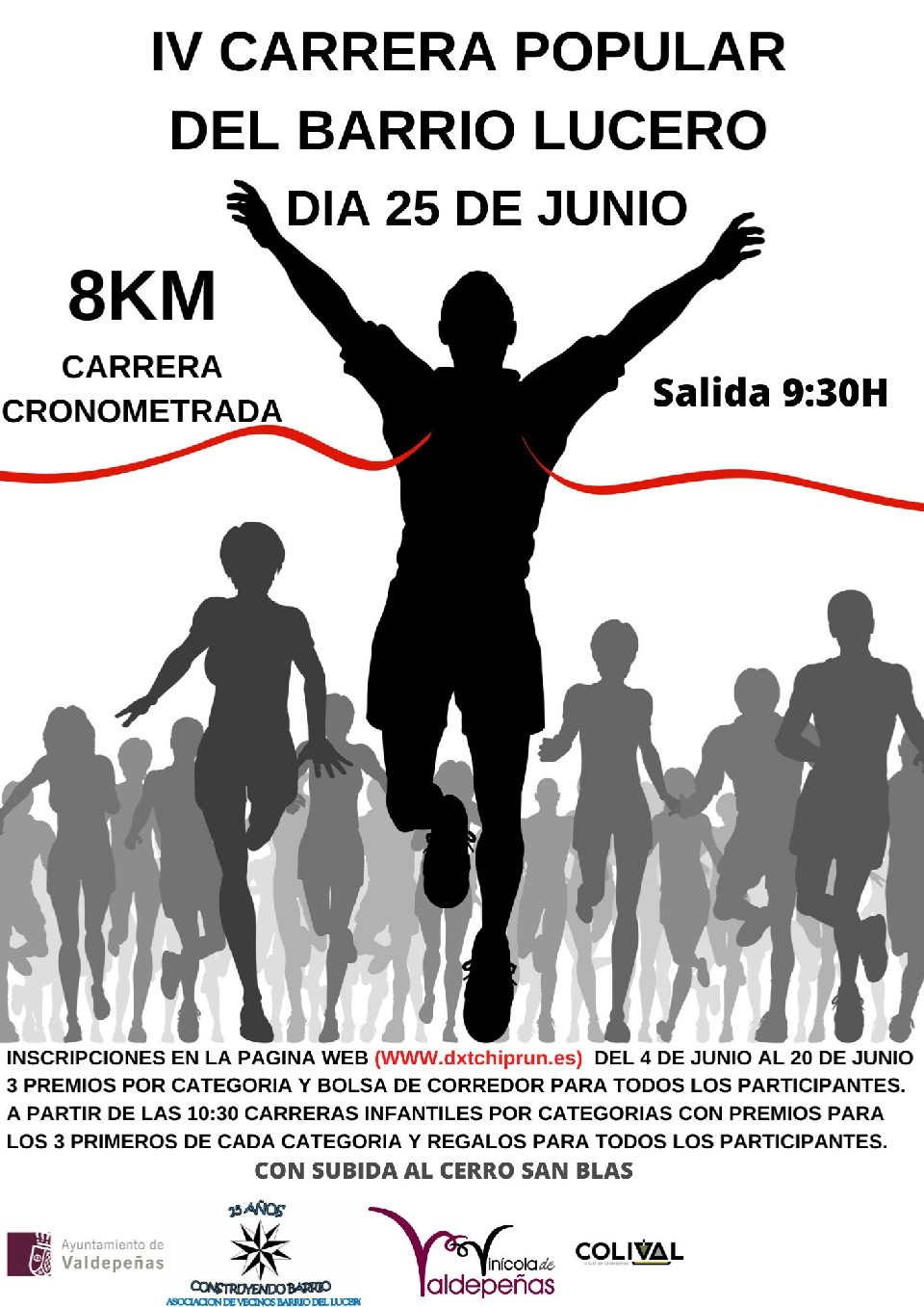 REGLAMENTO OFICIAL IV CARRERA POPULAR BARRIO DEL LUCERO 25/06/23 ORGANIZACIÓN La asociación de vecinos Barrio del Lucero de Valdepeñas, organiza la IV edición de su Carrera Popular en honor a las fiestas de San Juan, que se celebrará el 25 de junio del 2023 a las 09:30 horas. La salida se situará en las inmediaciones de la Sede de la Asociación (c/Luz, nº 35), y la meta en las nuevas instalaciones del Velodrómo municipal (situado al final de la c/Lucero), estando debidamente señalizado y contando con la presencia de Protección Civil y Policía Local de Valdepeñas, así como voluntarios para el corte de calles. PRUEBA Y RECORRIDO Esta prueba será cronometrada por la empresa DxT Chip Run Carreras y tendrá un recorrido de 8 km incluyendo la subida a los molinos del Cerro de San Blas. El itinerario estará señalizado y siempre se seguirán las marcas e indicaciones que habrá puesto la organización. Es obligatorio seguir el itinerario señalizado, de no ser así, será motivo de descalificación. La organización situará en determinados puntos del recorrido personal encargado de velar por la seguridad de los participantes. Se establece un tiempo máximo de una hora y diez minutos para realizar la prueba. Se sitúan dos puntos de avituallamiento, uno en la mitad del recorrido (cerro de San Blas) y un segundo punto al finalizar la prueba, donde se dispondrá de complementos líquidos, fruta, frutos secos, … CATEGORÍAS Categoría general masculina (De 18 años a 34 años) Categoría general femenina (De 18 años a 34 años) Categoría máster 35 masculina (De 35 años a 49 años) Categoría máster 35 femenina (De 35 años a 49 años) Categoría máster 50 masculina (De 50 años en adelante) Categoría máster 50 femenina (De 50 años en adelante) INSCRIPCIONES La prueba está abierta a todas las personas con edad mínima de 18 años cumplidos antes del día de la misma. Se permitirá la participación a menores con edades comprendidas entre 14 y 17 años con autorización por escrito de padre, madre ó tutor/a legal, presentando escrito firmado. El plazo de inscripción comienza el lunes 05/06/22 y finaliza el martes 20/06/22 a las 12:00 horas. Las inscripciones se realizarán en la web de la empresa organizadora de eventos deportivos DxT Chip Run Carreras (www.dxtchiprun.es ) y estará limitada a 250 participantes. Para formalizar la inscripción y recogida del dorsal será necesario presentar el D.N.I. en el nuevo Velódromo (al final de la c/Lucero) de 08:30 a 09:15 del mismo día de la carrera. A cada corredor se le entregará un dorsal nominativo e intransferible, que deberá llevar durante el recorrido situado en la parte delantera, siendo visible sin contarlo nidoblarlo. El importe de la inscripción será de 12€, y da derecho a: -Bolsa del corredor. -Avituallamientos líquidos y sólidos durante y al finalizar la prueba. -Dorsal personalizado con chip -Uso del dispositivo de seguridad -Descarga de diploma INSCRIPCIONES INFANTILES Se realizarán en la web (www.dxtchiprun.es) Son totalmente gratuitas. Categorías: Pitufos: nacidos en 2016/2017 (distancia 200 metros) Benjamin: nacidos en 2015/2014 (distancia 400 metros) Alevin: nacidos 2012/2013 (distancia 600 metros) Infantil: nacidos 2010/2011 (distancia 800 metros) Las carreras infantiles se desarrollarán dentro del nuevo Velódromo de 10:30 a 11:15 Se habilitarán 5 dorsales por categoría para quien no se haya inscrito anteriormente por la página habilitada. Premio para los tres primeros clasificados de cada categoría. Bolsa de chuches y complemento líquido para todos los participantes. Máximo de 200 dorsales entre todas las categorías infantiles. CLASIFICACIÓN Y PREMIOS La entrega de premios de la carrera popular y las carreras infantiles, a los tres primeros clasificados de cada categoría, tendrá lugar en la explanada de la Sede Habrá un premio especial al participante de mayor edad en la carrera popular. INSTALACIONES Servicios, vestuarios, taquillas y duchas en las instalaciones del nuevo velódromo. La asociación instalará barra de bar con bebidas y montados a precios populares. MOTIVOS DE DESCALIFICACIÓN La organización de la prueba se reserva el derecho a descalificar a cualquier participante si no cumple las siguientes normas: -Transitar por fuera del recorrido marcado por la organización. -No seguir las instrucciones de los miembros de control y organización. -Obstaculizar voluntariamente a otro corredor. -Superar el tiempo de corte marcado por la organización. -Manipular ó no llevar visible el dorsal en la parte delantera. ACEPTACIÓN Todo participante por el hecho de inscribirse acepta las condiciones establecidas en el presente reglamento. Cualquier circunstancia no prevista en este reglamento será resuelta por laorganización. La inscripción implica el consentimiento expreso del participante para el uso de los datos y las imágenes que se obtendrán durante la misma, con el fin de promocionar la prueba y difundir información de la misma. RECLAMACIONES Cualquier reclamación solo será atendida si a juicio de la organización está debidamente justificada y documentada. PROTECCIÓN DE DATOS PROTECCIÓN DE DATOS: Le informamos que los datos personales proporcionados pasarán a formar parte de nuestro sistema de gestión y serán tratados y gestionados por DXT Base, S.C. de Enseñanza de Castilla La Mancha y el organizador del evento en cada caso como responsables del tratamiento, siendo sus finalidades legitimas la gestión de participantes inscritos, organización y gestión de actividades solicitadas y para mantenerles informados de otras actividades y eventos de su interés previo consentimiento del interesado. Así mismo, deseamos informarles que los datos personales (nombre y apellidos y en su caso club al que pertenecen) de los inscritos, resultados oficiales y clasificación obtenida, imágenes y contenido audiovisual podrán aparecer en memorias, revistas, página web, red