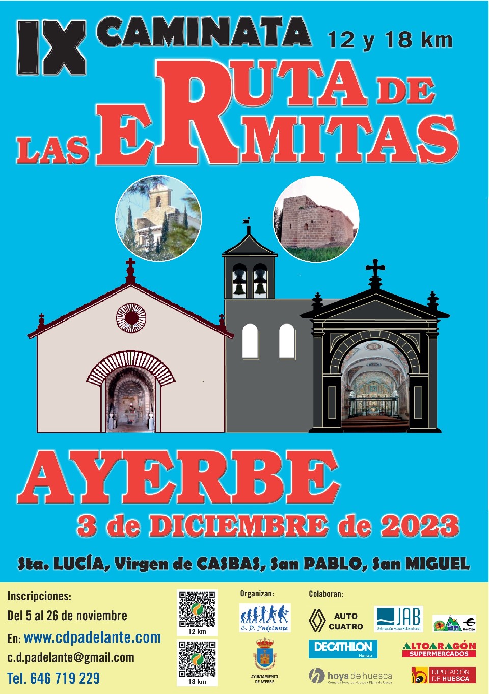 - El Club Deportivo Padelante y el Ayuntamiento de Ayerbe organizan la IX Caminata RUTA DE LAS ERMITAS, el próximo domingo 3 de diciembre de 2023.
