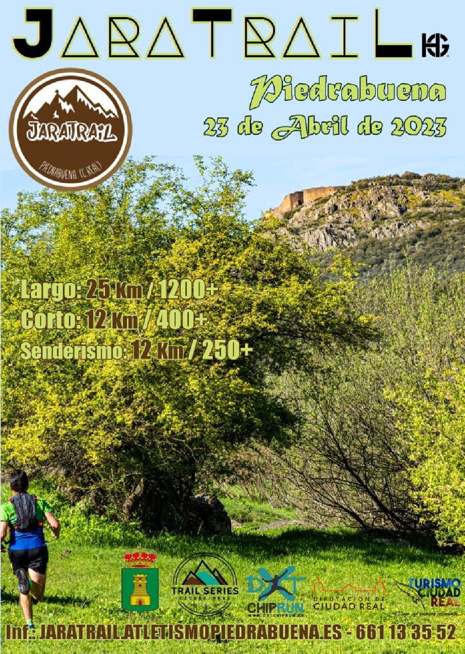 ORGANIZACIÓN El Excelentísimo Ayuntamiento de Piedrabuena junto con el Club de Atletismo “A ver quien tira” organiza la V Edición del JARATRAIL que se celebrará el 23 de abril de 2023. La salida y meta se sitúan en la plaza de Toros, estando debidamente señalizados y contando con la presencia de Protección Civil y de la Policía Local de Piedrabuena, así como de voluntarios. 2. PRUEBAS Y RECORRIDO Este trail se compone de 3 pruebas: • SENDERISTA: --10 kilómetros con 250 metros + . • Salida a las 10:15 horas. • TRAIL Corto: Carrera de montaña de 12 kilómetros con 400 metros +. Salida a las 10:00 horas. • TRAIL LARGO: Carrera de montaña de 25 kilómetros con 1200 metros +. Salida a las 09:30 horas. El cierre de carrera y ruta será a las 13:00 horas para todas las pruebas. El itinerario estará señalizado especialmente para las carreras, se seguirán las marcas que habrá puesto la Organización, consistentes en cintas de balizar, banderolas, marcas pintadas horizontales y verticales, marcas de cal en el suelo, etc. Cada participante debe ser plenamente consciente de la dificultad física y técnica de la prueba y de las condiciones climáticas, por tanto, debe prever que su indumentaria y calzado sean los más apropiados para realizar esta prueba. La organización situará en determinados puntos del recorrido y en los controles de paso, personal encargado de velar por la seguridad de los participantes. Es obligatorio seguir las indicaciones de este personal. Se establecerán puntos de avituallamiento a lo largo del recorrido y serán de dos tipos: • Líquidos • Completos (líquidos + fruta, frutos secos, etc...) Los corredores no podrán sacar nada, debiendo consumir en el mismo punto los alimentos que ahí encontrarán. El Trail largo dispondrá de 4 avituallamientos, los cuales serán completos. No habrá más de 5km de distancia entre avituallamientos. El Trail corto dispondrá de 2 avituallamientos, los cuales serán completos. No habrá más de 5km de distancia entre avituallamientos. Es obligación de cada participante llevar sus desperdicios hasta las zonas habilitadas por la organización. La organización NO PROVEERÁ DE VASOS en los avituallamientos. Cada participante debe portar su vaso. En caso de malas condiciones meteorológicas o por razones de seguridad, la organización se reserva el derecho de parar la prueba, modificar el recorrido o de variar los límites horarios, así como los propios recorridos. 3. CATEGORÍAS Cada recorrido tiene las siguientes categorías: • Categoría general Masculino / Femenino • Máster “A” Masculino / Femenino (De 40 a 49 años). • Máster “B” Masculino / Femenino ( De 50 años en adelante) • Categoría Local Masculino / Femenino. *Considerando local aquellas personas empadronadas en Piedrabuena y/o socio del club “a ver quién tira”. 4. INSCRIPCIÓN La prueba está abierta a todos los deportistas con edad mínima de 18 años cumplidos antes del día de la prueba para los recorridos TRAIL LARGO. Se permitirá la participación a menores con edades comprendidas entre 16 y 18 años, en el recorrido TRAIL CORTO con autorización paterna (padre, madre, tutor/a). El plazo de inscripciones comenzará el 17 de FEBRERO de 2023. Habrá 2 opciones: CON bolsa del corredor que el plazo finalizara el 23 de Marzo de 2023. Y SIN bolsa del corredor que el plazo de finalizara el 17 de Abril de 2023. Las inscripciones de realizarán en la web de la empresa organizadora de eventos deportivos www.dxtchiprun.es Existirá un email para incidencias en la inscripción que será: contacto@dxtchiprun.es Para formalizar la inscripción y recoger el dorsal será necesario presentar el DNI, pasaporte o documento equivalente y justificante del padre, madre o tutor en caso de ser menor de edad. Los dorsales se podrán recoger el día 22 de abril de 2023, desde las 18:00 horas hasta las 20:00 horas en la Plaza de Toros de Piedrabuena. También el mismo día de la carrera desde las 08:00 horas hasta las 09:45 horas. El importe de la inscripción CON bolsa del corredor: • SENDERISMO: 22 € / SIN bolsa: 10 € • TRAIL LARGO: 25 € / SIN bolsa: 15 € • TRAIL CORTO: 25 € / SIN bolsa: 15 € A cada corredor se le entregará un dorsal nominativo e intransferible, que deberá llevar durante todo el recorrido situado en la parte delantera, entre pecho y cintura, bien visible sin doblar ni cortar. Además, es imprescindible presentar el Pliego de Extensión de Responsabilidad rellenando y firmado, aceptando el reglamento de la prueba. La inscripción a las pruebas da derecho a: • Bolsa de corredor • Duchas (Pabellón de Deportes) • Avituallamientos sólidos y líquidos durante la carrera • Avituallamiento en meta • Dorsal • Cronometraje de la prueba • Seguro médico para asistencia sanitaria • Aperitivo post carrera •Uso del dispositivo de seguridad • Seguro individual y de responsabilidad civil 4. CLASIFICACIÓN Y PREMIOS La entrega de trofeos tendrá lugar a partir de las 13:00 horas. Toda delegación en otra persona para recoger su trofeo por parte de un ganador deberá ser conocida y autorizada por la organización como mínimo media hora antes de dicho acto. • TRAIL LARGO: Categoría General 1º Masculino/femenino, trofeo + lote de productos locales. 2º Masculino/femenino, trofeo + lote de productos locales. 3º Masculino/femenino, trofeo + lote de productos locales. Categoría Local 1º Masculino/femenino, trofeo + lote de productos locales. 2º Masculino/femenino, trofeo + lote de productos locales. 3º Masculino/femenino, trofeo + lote de productos locales. Categoría Máster “A” ( De 40 a 49 años). 1º Masculino/femenino, trofeo + lote de productos locales. 2º Masculino/femenino, trofeo + lote de productos locales. 3º Masculino/femenino, trofeo + lote de productos locales. Categoría Máster “B” ( De 50 años en adelante). 1º Masculino/femenino, trofeo + lote de productos locales. 