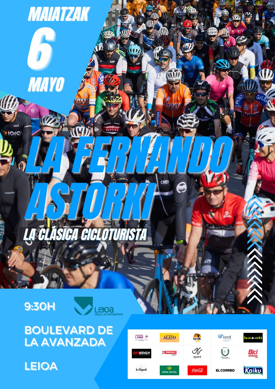 La XXVI edición de la FERNANDO ASTORKI tendrá como hora de salida oficial las 09:30 horas del sábado 6 de mayo de 2023 en el Boulevard Avanzada de Leioa. El recorrido consta de 90 Km. Y finalizará en el mismo lugar de la salida.