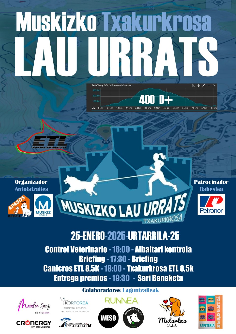 Results Lau Urrats Txakurkrosa 25/01/2025 18:00 8.5km View results Contact info Contact the organizer – Rules REGLAMENTO LAU URRATS 2025 REGLAMENTO ETL CAS REGLAMENTO ETL EUS ⎼⎼⎼⎼⎼⎼ Read more ⎼⎼⎼⎼⎼⎼
