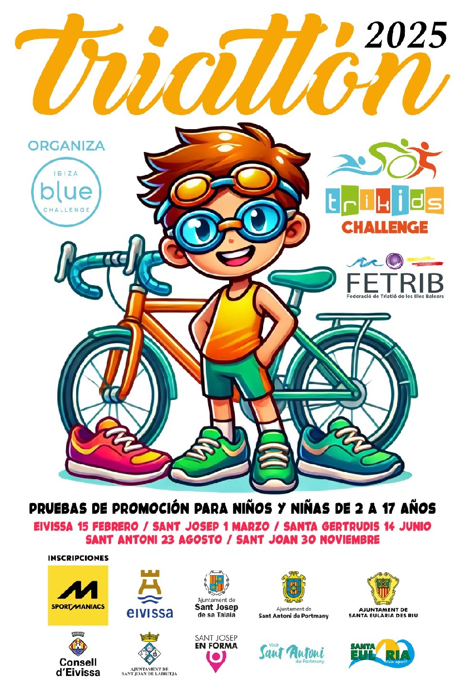 1. El VIII TRI KIDS SANT JOSEP 2025 es una prueba organizada por Ibiza Blue Challenge en colaboración con la Federación Balear de Triatlón y el Ayuntamiento d´Eivissa que tendrá, como fecha de celebración, el próximo sábado 22 de marzo a las 16:30 horas con salida y meta en el Poliesportiu de Can Guerxo.