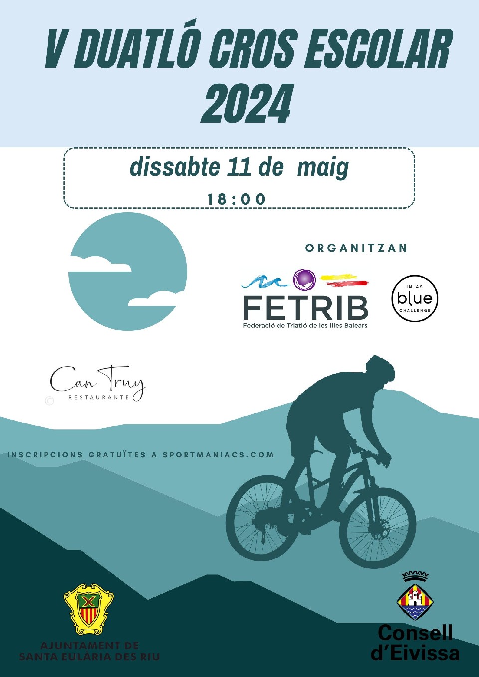 1. El V DUATLÓ CROS ESCOLAR 2024 es una prueba organizada por la Federación Balear de Triatlón e Ibiza Blue Challenge, patrocinada por el Consell Insular de Ibiza, con la colaboración del Ayuntamiento de Santa Eulària y el Restaurante Can Truy. La prueba se celebra en los terrenos del restaurante Can Truy y terrenos anexos.