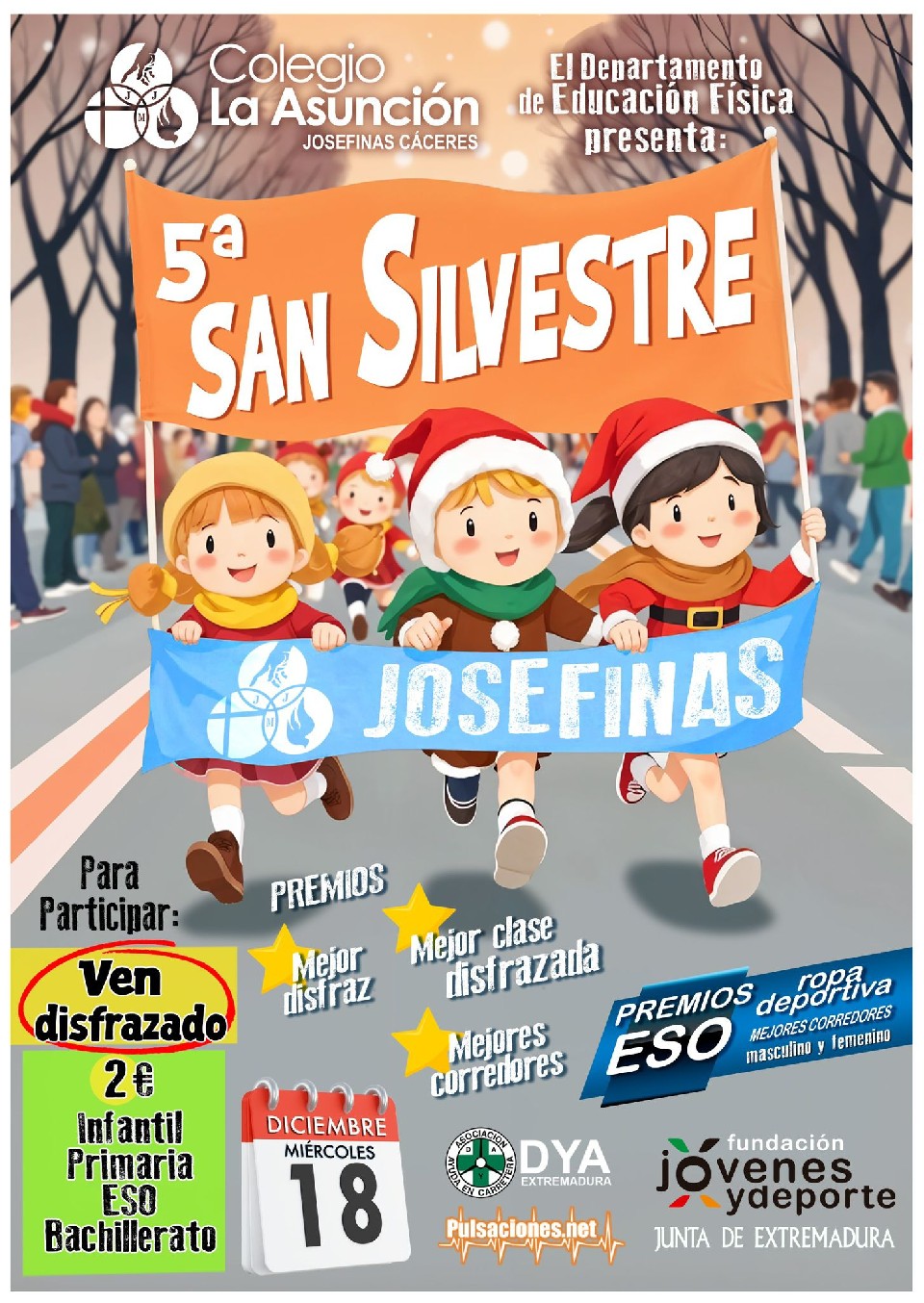 Toda la info en la web del evento: https://www.pulsaciones.net/carreras/18-12-2024-v-san-silvestre-colegio-la-asuncion-josefinas-caceres/