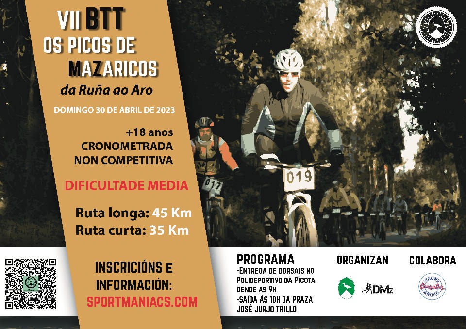 1.- O Concello de Mazaricos, organiza a VII Ruta BTT de Mazaricos que terá lugar o Domingo 30 de abril do 2023, cun percorrido de 45 km. de dificultade Media. A mesma será de carácter non competitivo.
