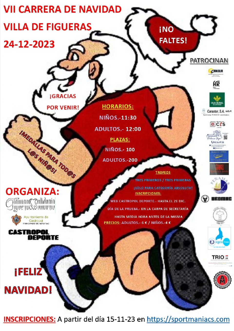 1.- La ASOCIACIÓN FIGUERAS SOLIDARIO, Ayuntamiento de Castropol y Castropol Deporte organizan la VII Carrera de Navidad Villa de Figueras que discurrirá por un circuito urbano. El recorrido de la misma será de 4500 metros y en ella podrá participar cualquier persona de 15 años o más. La salida y la llegada de la prueba estará ubicada en el mismo punto, a la altura de las escuelas de Figueras.