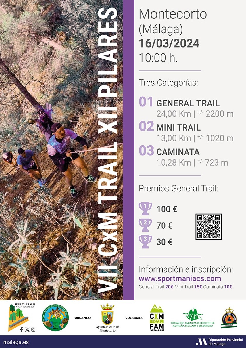 REGLAMENTO VII TRAIL XII PILARES MONTECORTO 1.-ORAGANIZACIÓN: El Excmo. Ayuntamiento de Montecorto, organiza el VII TRAIL XII PILARES DE MONTECORTO, que se celebrara el día 16 de Mazo de 2024, siendo la segunda carrera puntuable del circuito de carreras por montaña NATURAVENTURA TRAIL SERIES 2024, en su recorrido de 24 km. 2.-CARRERA: Se celebraran dos carreras y una caminata senderista. Un Mini Trail sobre un recorrido aproximado de 13 km, en los alrededores de Montecorto, con un desnivel +/- 1080m (Positivo 540 y Negativo 540), un Trail sobre un recorrido aproximado de 24 Km, en los alrededores de Montecorto, con un desnivel +/- 2572m (Positivo 1186 y Negativo 1286). Y una Caminata Senderista, en los alrededores de Montecorto sobre un recorrido aproximado de 10 Km 3.-LUGAR DE SALIDA Y META: La salida del VII TRAIL XII PILARES DE MONTECORTO, en sus tres modalidades, tendrá lugar a las 10:00h del día 16 de Marzo de 2024 desde la Plaza de Andalucía. La Meta estará situada en el mismo lugar que la Salida, en la Plaza de Andalucía. 4.-PARTICIPANTES: La participación en las pruebas será individual. Podrán participar en el Trail de 24 Km todo aquel deportista mayor de 16 años o que cumpla los 16 años en el año 2024, y en el Mini Trail y Caminata Senderista todo aquel deportista mayor de de 15 años o que cumplan 15 años en el años 2024, siempre que reúnan las condiciones físicas adecuadas para finalizarla correctamente en el tiempo máximo establecido. Para los menores de edad será necesario autorización paterna. Reservándose el Excmo. Ayuntamiento de Montecorto, como organizador de la prueba el derecho de admisión a la misma, pudiendo desestimar la inscripción de cualquier atleta que crea que vulnera el espíritu de la prueba. En caso que en la fecha de la prueba un atleta no haya cumplido los 18 años, se necesitara autorización paterna. 5.-CATEGORIAS: Las categorías masculinas y femeninas serán las siguientes: Mini Trail Cadetes: 15 y 16 años Juvenil: 17 y 18 años Junior: 19 y 20 años General: de 21 en adelante Sénior: de 21 a 39 años Veterano A: de 40 a 49 años Veterano B: de 50 a 59 años Veterano C: de 60 en adelante Trail Absoluta: de 18 en adelante Promesa: de 18 a 23 años Sénior: de 24 a 39 años Veterano : de 40 a 50 años Máster A: de 51 a 60 años Máster B: de 61 en adelante Local: corredores empadronados y/o nacidos en el municipio de Montecorto. Discapacitados físicos a pie: corredores con discapacidad física que puedan realizar el recorrido corriendo. Caminata Senderista La caminata senderista no será competitiva. Los premios no son acumulativos. 6.-INSCRIPCIONES: El número total de participantes entre todas las modalidades será de 600 plazas. Siendo 300 plazas para el Trail 24km y 200 para el Mini Trail y 100 plazas para la caminata senderista. El plazo de inscripciones se establece desde el viernes 5 de Enero a las 21.00h, hasta el domingo 03 de Marzo a las14.00h o hasta que se agoten las plazas a través de la plataforma digital de sportmaniacs (https://sportmaniacs.com/c/vii-trail-xii-pilares-de-montecorto). No se admitirán inscripciones fuera de plazo o cubierto el cupo de inscritos. 7.-PRECIO: El precio de la inscripción será de de 20 € para el Trail de 24 km, de 15€ para el Mini Trail y de 10€ para la Caminata Senderista. El pago a dicha inscripción da derecho a: Parking Gratuito Guardarropa Gratuito Seguro individual de accidentes Avituallamientos Avituallamiento de Meta Bolsa del corredor Medalla Finisher Servicio de duchas Comida Post-Carrera Servicio de ambulancia y Asistencia médica. Otros servicios que la organización pueda conseguir. No se procederá a la devolución del importe de la inscripción en caso de no participación, sea cual fuere el motivo. 8.-AVITUALLAMIENTOS. La Organización tiene previsto los siguientes puntos de Avituallamiento: MINI TRAIL 13 KM LUGAR PARCIAL ACUMULADO KM Plaza Andalucía (SALIDA) 0,000 0,000 Casa Valen (AV1) 4,500 4,500 Cortijo del Mirro (AV2) 5,500 10,000 Plaza Andalucía (META) 3,000 13,000 TRAIL 24 KM LUGAR PARCIAL ACUMULADO KM Plaza Andalucía (SALIDA) 0,000 0,000 Casa Valen (AV1) 4,500 4,500 Cortijo del Mirro (AV2) 5,500 10,000 Calle Nacimiento (AV3) 7,000 17,000 Pinar (AV4) 4,000 21,000 Plaza Andalucía (META) 3,000 24,000 9.-DORSALES. La recogida de dorsales para todas las modalidades se podrá efectuar el viernes 15 de marzo de 2024 en horario de 18.00h a 20.00h y el sábado 16 de marzo en horario de 08.00 a 09.45h en el Ayuntamiento de Montecorto. Será imprescindible presentar el DNI para la recogida del dorsal, y recomendable presentar la ficha de inscripción. No se admitirán cambios de dorsal sin la autorización de la Organización. 10.-SEÑALIZACION. El recorrido estará señalizado con postes de seguimiento con placas informativas y paneles informativos, reforzado con trozos de cinta de plástico de color vivo, banderines, carteles y flechas, así como el personal voluntario o de la Organización en aquellos lugares que se estime oportuno, siendo obligatorio el paso por los controles establecidos en los puntos de Avituallamiento. 11.-TIEMPOS DE PASO Y CORTE. Habrá cierre de controles, siendo 5:00 horas de tiempo máximo (desde el inicio de la prueba) para entrar en Meta, en la carrera larga y de 4:00 horas en la carrera corta. Los participantes que sobrepasen ese tiempo deberán retirarse de la prueba, ya que ni la Organización ni los Servicios de Asistencia pueden garantizar su cobertura en caso de accidente. Así mismo, los “corredores escoba” de la prueba o el responsable de cada control de Avituallamiento tendrán potestad para retirar de la prueba a cualquier participante si su tiempo de carrera o su estado de salud así lo aconsejan. 12.-PREMIOS. Los 3 primeros/as clasificados/as de categoría General y de cada Subcategorías tanto en el Mini Trail como en el Trail. Además tendrán premios en matalico los 3 primeros/as clasificados/as en el Trail d