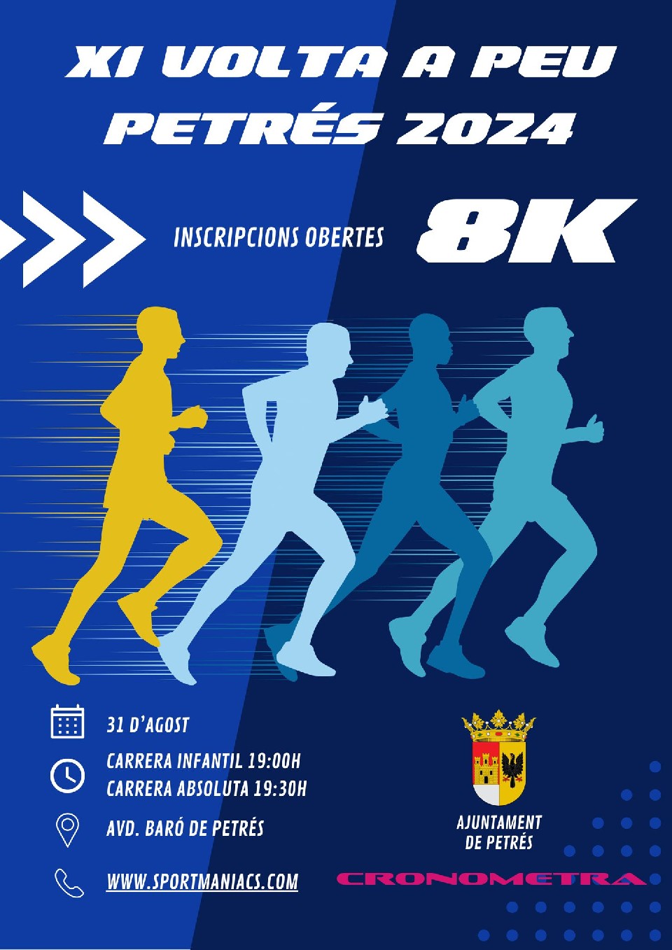 Articulo 1º: El Exmo. Ayuntamiento de Petrés, organiza en colaboración diversas entidades locales la XI Volta a peu Petrés, que se celebrará el sábado 31 de agosto de 2024. Prueba sin distinción de sexo, raza o religión y donde pueden participar todos los atletas federados o no con fecha de nacimiento a partir de 2010. Los corredores de 14, 15, 16 y 17 años deberán aportar autorización paterna y presentarla a la recogida del dorsal.