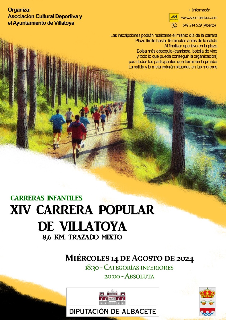 1ª. La asociación Cultural Deportiva junto al Ayuntamiento de Villatoya organiza la XIII Carrera Popular de Villatoya que se celebrará el lunes 14 de Agosto a las 20:00 horas.Podrá participar cualquier persona que se crea capacitada.