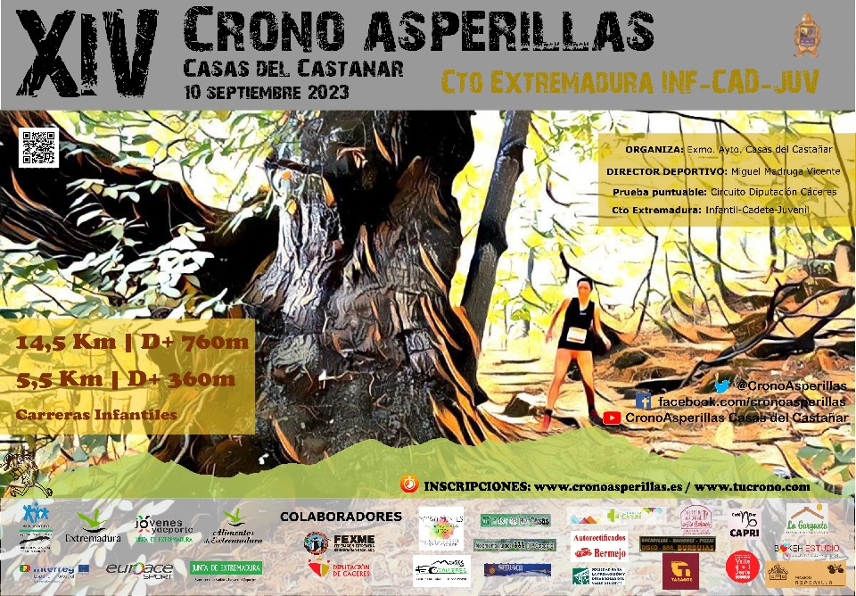 REGLAMENTO DE LA PRUEBA XIV CARRERA POR MONTAÑA CONTRA EL CRONO “ASPERILLAS” IX Mini Crono “Asperillas” 10 SEPTIEMBRE 2023 · CASAS DEL CASTAÑAR (CÁCERES) Preámbulo: Todos los términos de este REGALMENTO que emplean la forma del masculino genérico se entenderán aplicables a personas de ambos sexos. - Hora: 09:30 corredores - Web: www.cronoasperillas.es - Mail: cronoasperillas@gmail.com - Tlfn: 927 478001 (Ayuntamiento) – 676742790 (Dirección Deportiva) - ARTÍCULO 2. DATOS DEL CIRCUITO: - Itinerario: • Salida: CRA Riscos de Villavieja (frente al Centro de Salud) • Salida individual con diferencia entre participantes de 20 segundos • Recorrido: Depósito abastecimiento agua - La Cañada – El Pendón – La Cebadilla – San Bernabé – Alto Los Puertecitos – Conejero – Fontanal – Escobanchas – Ruta de los Castaños Centenarios – Jurriero y CRA Riscos Villavieja (Meta) - Distancia Crono Asperillas: 14,5 kms. • Desnivel acumulado 1560m (D+ 780m) • Pendiente máxima: 33,3% • Pendiente media 9,3 % - Distancia Mini Crono Asperillas: 5,5 kms • Desnivel acumulado 728m (D+ 380m) • Pendiente máxima: 34,7% • Pendiente media 12,4 % ARTÍCULO 3: PARTICIPANTES: Límite de participantes: • Crono ASPERILLAS: Número máximo de participantes: 120. • Mini Crono Asperillas: Número máximo de participantes: 30. - En la Mini Crono (5,5 kms) podrán participar las personas mayores de 13 años edad que lo deseen, ya sean corredores federados o no, los NO FEDERADOS contarán para ese día con la licencia de 1 día (seguro de accidentes de un día). Los menores deberán entregar la autorización firmada por su padre/madre/tutor al realizar la inscripción. En la prueba Crono Asperillas (14,5 kms), será necesario tener 17 años o más para poder participar. - En caso de existir dorsales libres, habrá un plazo extraordinario SOLO PARA FEDERADOS el mismo día de la prueba y hasta las 08.30 de la mañana en la secretaría de la prueba. Esta inscripción tiene un coste adicional de 5€ con respecto al precio del plazo 2. La prueba Crono Asperillas puntúa para la Liga Extremeña de Carreras por Montaña de FEXME y para el Circuito Diputación de Cáceres. Asimismo, la prueba Crono (14,5 kms) será Cto de Extremadura de categoría inferiores (Juvenil 17-18) y la prueba Mini Crono será Cto de Extremadura de categorías inferiores (Infantil 13-14, Cadete 15-16). ARTÍCULO 4. CATEGORÍAS CARRERA CRONO INDIVIDUAL: 1. CATEGORÍAS CARRERA CRONO ASPERILLAS: El día de referencia para la edad de cada categoría será el que tenga el atleta el 31 de diciembre de 2023 Masculino: • Juvenil Masculino: 17-18 • Joven Masculino: 19-23 • Senior Masculino: 24-39 • Veterano A: 40-49 • Veterano B: 50-59 • Veterano C: +60 • Inclusiva Femenino: • Juvenil Femenina: 17-18 • Joven Femenina: 19-23 • Senior Femenina: 24-39 • Veterana: 40-49 • Veterana B: 50-59 • Veterana C: +60 • Inclusiva Parejas: • PAREJAS MASCULINAS • PAREJAS FEMENINAS • PAREJAS MIXTAS 2. CATEGORÍAS CARRERA MINI CRONO ASPERILLAS: El día de referencia para la edad de cada categoría será el que tenga el atleta el 31 de diciembre de 2023 Masculino: • Infantil Masculino: 13-14 • Cadete Masculino: 15-16 • Senior Masculino: 17-39 • Veterano A: 40-49 • Veterano B: 50-59 • Veterano C: +60 • Inclusiva Femenino: • Infantil Femenina: 13-14 • Cadete Femenina: 15-16 • Senior Femenina: 17-39 • Veterana A: 40-49 • Veterano B: 50-59 • Veterano C: +60 • Inclusiva 3. OTRAS CATEGORÍAS ESPECIALES (Solo para CRONO ASPERILLAS) • Equipos: al menos 4 corredores en meta (bien sean hombres o mujeres) • Mancomunidad (masculino o femenino) • Local (masculino y femenino) * Aquellas categorías que no cuenten con al menos 4 participantes, pueden ser integradas en la posterior (excepto en las categorías especiales). ARTÍCULO 5. HORARIOS Y DISTANCIAS: - Salida CRONO ASPERILLAS: (14,4 kms cronometrados). En Casas del Castañar en el CRA Riscos de Villavieja a las 09.30 horas. Tiempo máximo para la carrera 2 horas 15 minutos tras la salida del corredor. La salida se realizará cada 20'', el corredor recibirá cuenta atrás los últimos 5 segundos. - Salida MINI CRONO ASPERILLAS: (5,5 kms cronometrados). En Casas del Castañar en el CRA Riscos de Villavieja a las 09.30 horas. Tiempo máximo para la carrera 1 hora 15 minutos tras la salida del corredor. La salida se realizará cada 20'', el corredor recibirá cuenta atrás los últimos 5 segundos. ARTÍCULO 6. PREMIOS: - Los premios que se entregarán se clasifican en las siguientes categorías, masculinas y femeninas - CARRERA CRONO ASPERILLAS: • Trofeos o medallas para la categoría Juvenil (3 para masculino y 3 para femenino) • Trofeos o medallas para la categoría Joven (3 para masculino y 3 para femenino) • Trofeos o medallas para la categoría Senior (3 para masculino y 3 para femenino) • Trofeos o medallas para la categoría Veterano A (3 para masculino y 3 para femenino) • Trofeos o medallas para la categoría Veterano B (3 para masculino y 3 para femenino) • Trofeos o medallas para la categoría Veterano C (3 para masculino y 3 para femenino) • Trofeos o medallas para categoría Mancomunidad (3 primeros masculino o femenino) • Trofeos o medallas para categoría Local (1º masculino y 1ª femenina) • Trofeos o medallas para categoría Inclusiva (3 primeros masculino y 3 primeras femenina) • Trofeos o medallas para la categoría GENERAL de la prueba (3 para masculino y 3 para femenino) • Trofeos o medallas para la categoría PAREJAS de la prueba (3 primeras parejas masculinas, femeninas o mixtas) Los participantes de la categoría PAREJAS sí puntúan de manera individual para la LIGA EXTREMEÑA DE CxM, pero solo optan al premio de la categoría PAREJAS. - CARRERA MINI CRONO ASPERILLAS: • Trofeos o medallas para la categoría Infantil (3 para masculino y 3 para femenino) • Trofeos o medallas pa