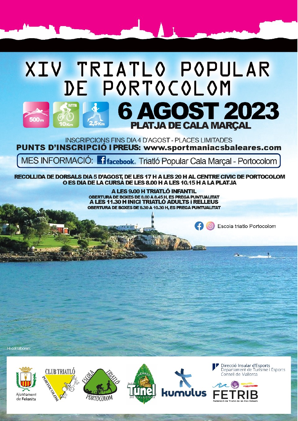 Recollida de dorsals: Dia 5 d'Agost al Centre Cívic de Portocolom. De les 17:00 a 20:00h. El mateix dia de la cursa de les 7:30 a 8:30h categories infantils i de 9:00h a 10:00h adults a la platja.