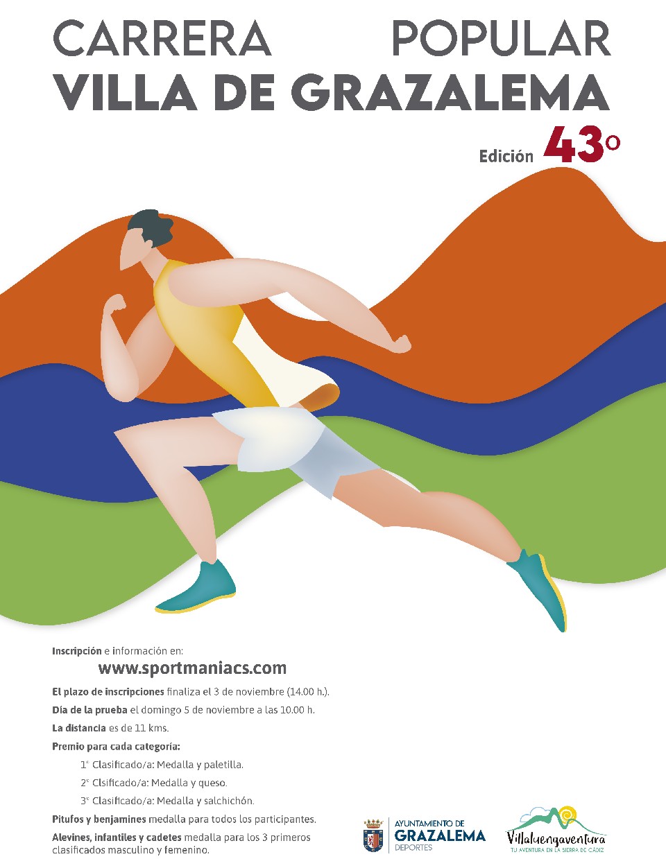 Reglamento 1º.- Podrán participar todas las personas que lo deseen, y que no padezcan enfermedad o estado físico que le incapacite para correr, - no haciéndose responsable la Organización de incidentes por no respetar esta norma. Los menores de edad deberán aportar auto- rización de padre, madre o tutor. 2º.- La distancia será de 11 Kms (mayores de 18 años) con el siguiente recorrido: Salida de la Plaza de España (frente a la Casa de la Juventud), subida por las calles Las Piedras y Nueva hasta el Camping Tajo Rodillo; bajada por la Carretera Alta hasta alcanzar el Puerto de los Alamillos (por la Fuente Abajo) y volviendo a la meta que estará situada en la Plaza de España. 3º.- Los vehículos autorizados para seguir la prueba, serán únicamente los designados por la Organización. 4º.- La salida se dará a las 10:00 h. (12:00 h. para las categorías infantiles) en la Plaza de España, Grazalema, cerrándose el control de meta 90 minutos después. La entrega de premios para todas las categorías será a las 13.30 h. 5º.- A lo largo del recorrido habrá servicio de avituallamiento, así como controles técnicos, siendo descalificada la persona que no pase por dichos controles. 6º.- Precio de la inscripción: 10 euros Día de la prueba: 20 euros Menores de 18 años: inscripción gratuita La inscripción se realizará online en la siguiente web: www.sportmaniacs.com https://sportmaniacs.com/c/xliii-carrera-popular-villa-de-grazalema El plazo de inscripción finaliza el día 3 de Noviembre a las 14.00 h. Excepcionalmente se admitirán inscripciones el día de la prueba hasta 30 minutos antes del comienzo (20 euros) y hasta com pletar los 200 participantes, el máximo de inscripciones fijado. 7º.- Entrega dorsales mayores y menores. La entrega de dorsales se efectuará el mismo día de la prueba en el siguiente horario: - Adultos: De 8:30 a 9:30 h. - Niños: De 8:30 a 11:30 h 8º.- Todos/as los/as corredores/as mayores de 18 años tendrán derecho a camiseta y bolsa de avituallamiento. 9º.- Todo/a corredor/a con derecho a premio deberá estar presente a la hora de la entrega y presentar el D.N.I. Su incomparecencia o la no presentación del documento acreditativo supondrá la renuncia al mismo. 10º.- Los premios no son acumulables (excepto las categorías locales) 11º.- La participación en la XLIII Carrera Popular Villa de Grazalema supone la aceptación del presente reglamento, así como correr bajo su propia responsabilidad. 12º.- Para lo no previsto se aplicará el crite-rio de la propia ORGANIZACIÓN. Más información en el 956 13 20 11 ext. 8