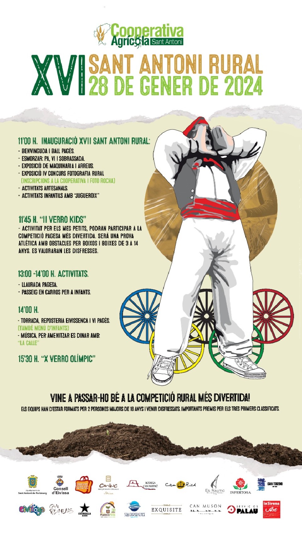 El VERRO OLÍMPIC se regirá por las normas contenidas en este reglamento. La competición tendrá lugar el domingo 28 de enero de 2024 a las 15.30 h en las instalaciones de la Cooperativa Agrícola Sant Antoni. Los equipos deben estar formados por 2 miembros. Los equipos deben venir disfrazados o enmariolados y deberán presentarse en las instalaciones de la Cooperativa media hora antes del inicio de la competición.
