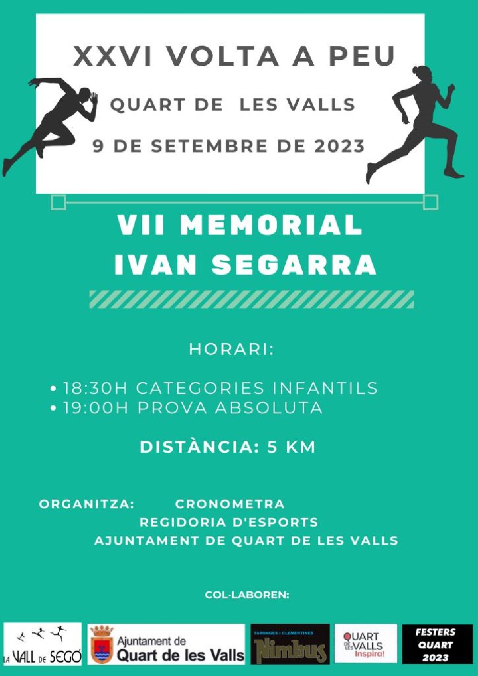 Art. 1) La Regidoria d’Esports de l’Ajuntament de Quart de les Valls organitza la XXVI Volta a Peu a Quart de les Valls VII Memorial Iván Segarra amb la col·laboració dels Festers de 2023, C.A. La Vall de Segó i altres organismes. Enguany la Volta a peu a Quart de les Valls forma part del III Circuit de Carreres Populars “CRONOMETRA” Camp de Morvedre