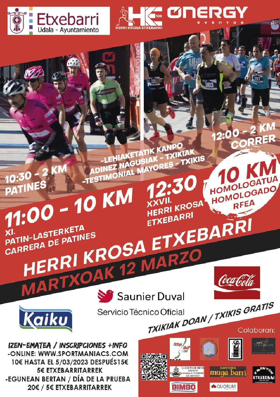 - 11:00 X Carrera de patines 10 km - Inscripción online: 10€ hasta el 5/03/2023, 15€ hasta el 10/03/2023 a las 23:00, 5€ para los corredores empadronados en Etxebarri y, presencial el día de la carrera si no se agotan dorsales: 5€ para los empadronados en Etxebarri y 20€ para el resto.