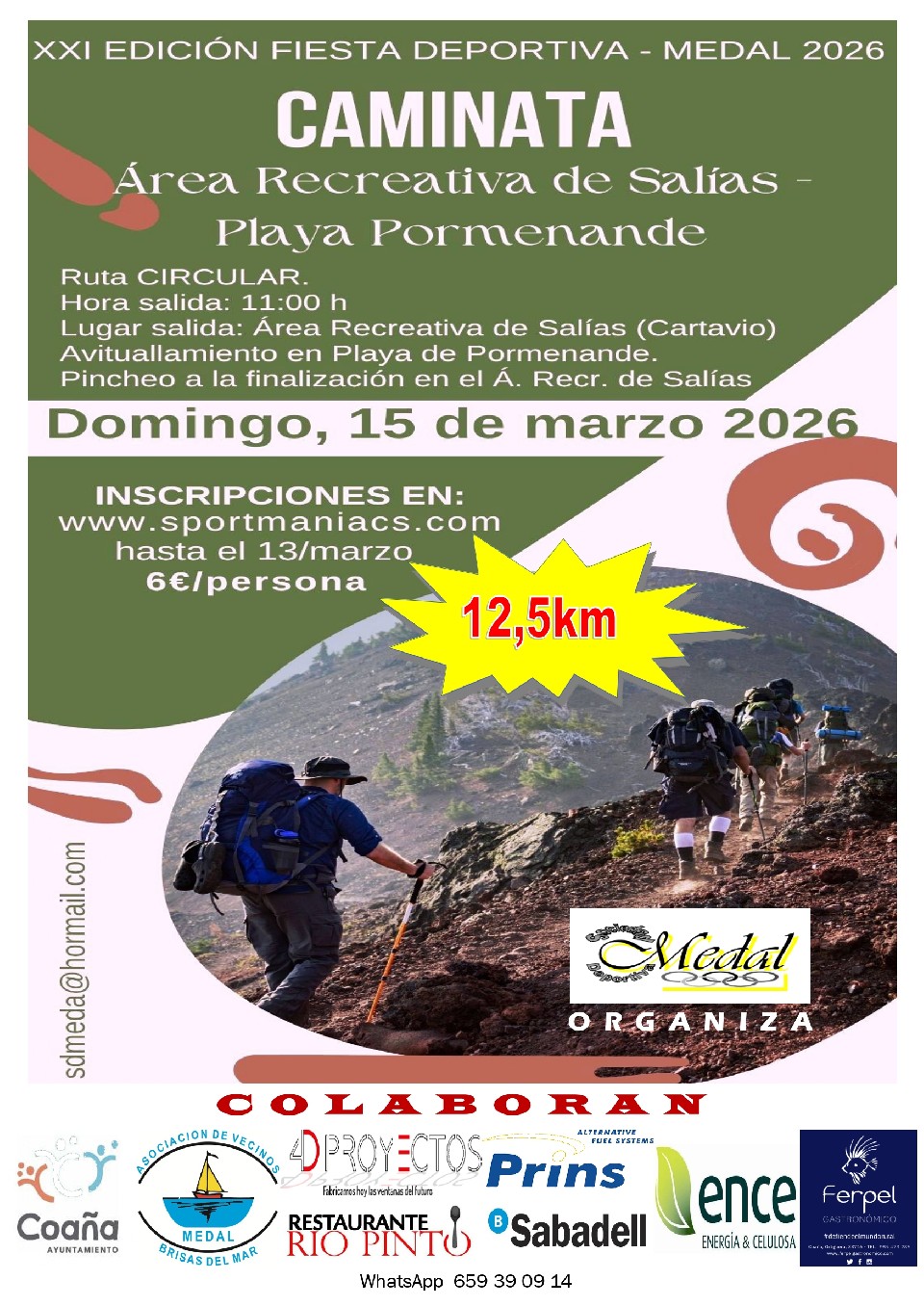 La Sociedad Deportiva de Medal, organiza el próximo domingo 15 de marzo de 2026, una caminata a pie de 12,5km CIRCULAR, con salida y llegada en el Área Recreativa de Salías (Cartavio).