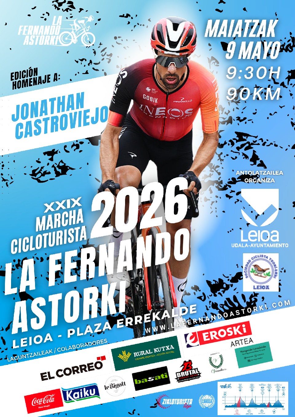 La XXVIII edición de la FERNANDO ASTORKI tendrá como hora de salida oficial las 09:30 horas del sábado 9 de mayo de 2026 en Errekalde Plaza de Leioa. El recorrido consta de 90 Km. Y finalizará en el mismo lugar de la salida.