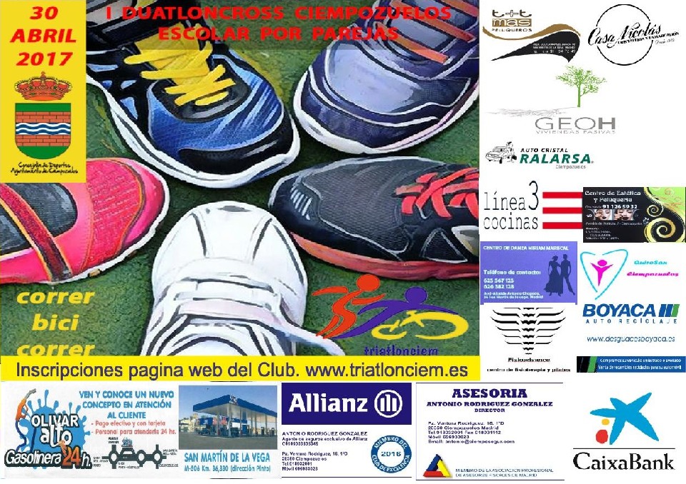 Clasificaciones Cadetes - Junior (Años 1999,2000, 2001 y 2002) 30/04/2017 10:00 8km Pendiente de Clasificación Infantiles (Años 2003 y 2004) 30/04/2017 10:00 4.5km Pendiente de Clasificación Alevines (Años 2005 y 2006) 30/04/2017 10:00 4.5km Pendiente de Clasificación Benjamín + Adulto (Años 2007 y 2008) 30/04/2017 10:00 3km Pendiente de Clasificación Prebenjamín + Adulto (Años 2009,2010 y 2011) 30/04/2017 10:00 2.1km Pendiente de Clasificación Información de contacto Contactar con el organizador – 677331685 Reglamento http://www.triatlonciem.es/