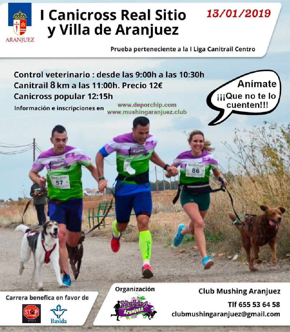 Clasificaciones GEN MAS Y FEM - Cierre de Inscripciones 11/01/2018 - Hasta las 10:00h de la mañana 13/01/2019 11:00 8km Pendiente de Clasificación Información de contacto Contactar con el organizador – Reglamento http://www.deporchip.com/eventos/pruebas2019/canicrossaranjuez19/reglamento.pdf