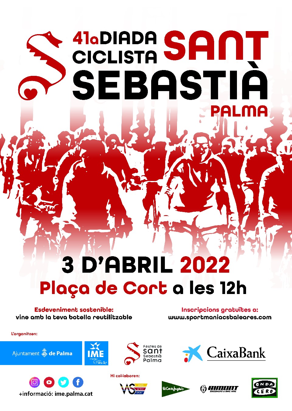 L’Institut Municipal de l’Esport (IME) de l’Ajuntament de Palma presenta la DIADA CICLISTA DE SANT SEBASTIÀ 2022, que, com cada any, tindrà lloc dia 3 d’abril, amb sortida a la pl. de Cort/pl. de Santa Eulàlia i arribada al Palau Municipal d’Esports Son Moix. Aquest esdeveniment té gran interès social i esportiu i és considerat una de les activitats més importants del programa de les Festes de Sant Sebastià, patró de la nostra ciutat. Durant aquests anys són moltes persones que han participat en un dels esdeveniments populars més importants de la nostra cultura popular i esportiva de Palma.