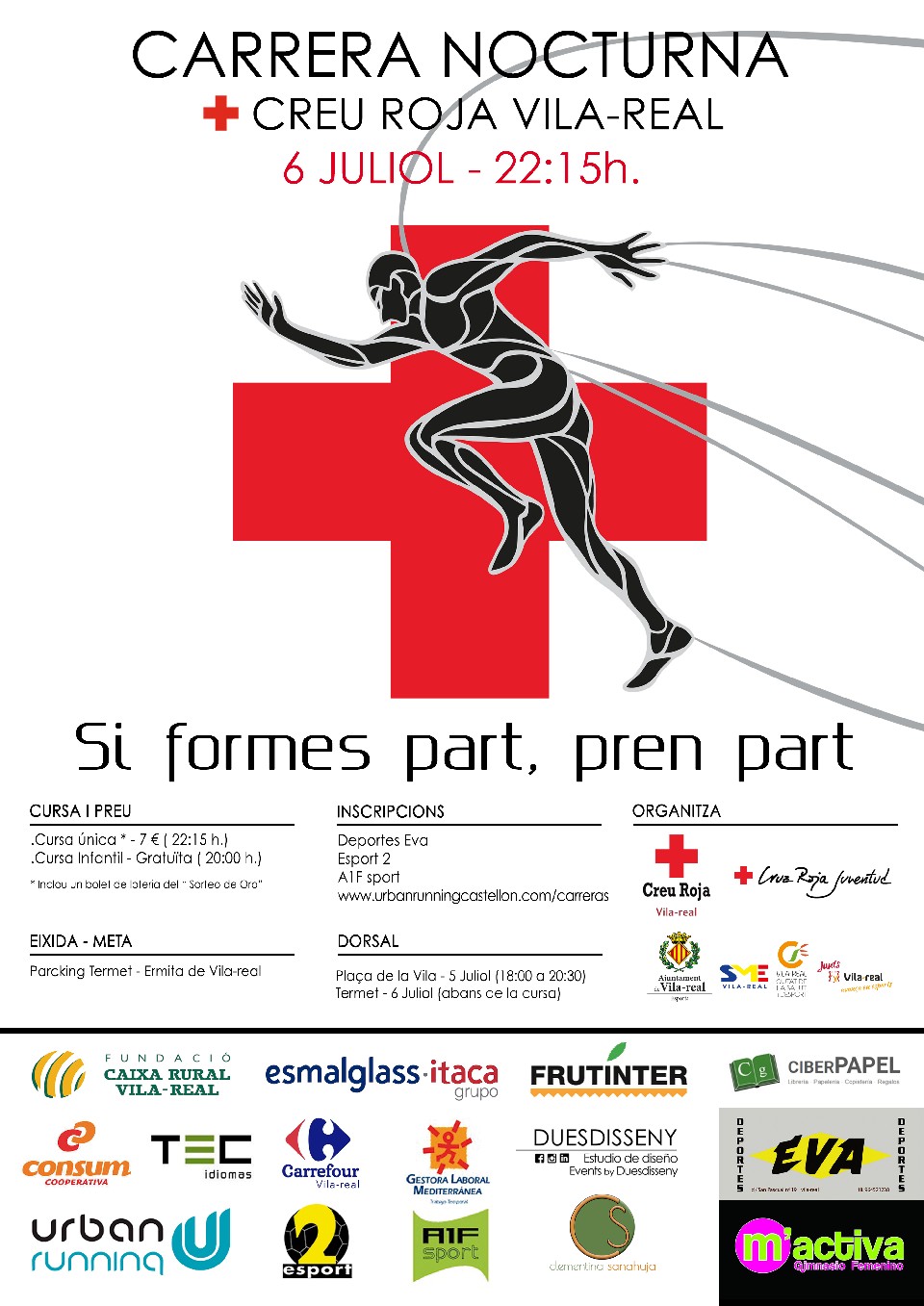 Un any més es fica en marxa el Sorteig de Or de Creu Roja, que ens ofereix una senzilla fórmula per a ajudar als que més ho necessiten. Perquè la labor de Creu Roja es ara més important que mai, y quanta més gent compre bolets, a més persones podrem aplegar amb acciones de caràcter preventiu, assistencial, rehabilitador y de desenvolupament. Aconseguir que els bolets de l’or apleguen al major número de gent possible es l’objectiu principal d’aquesta carrera solidaria, y posterior recaptació de fons per a poder dur a terme les activitats que es realitzen des de l’assemblea local de Creu Roja Vila-real. Perquè sense tu, la nostra labor no seria possible. Dades generals - Distància absoluta: 5000m d’asfalt. - Distància infantil: 800m pista Ermita. - Data: dissabte 6 de juliol de 2019 - Eixida en l’Ermita de Vila-real (davant del Termet): Carrera infantil a les 20:00 h Carrera absoluta a les 22:15 h - Dorsals a la Plaça de La Vila el divendres 5 de juliol en horari de 18:00 a 20:30 h i el dissabte dia 6 al Termet abans de la cursa. Inscripció Del 17 de juny al 3 de juliol. El preu de la inscripció son 7 euros, per a la carrera absoluta. La inscripció a la carrera infantil es gratuïta. Es pot formalitzar la inscripció de vàries formes: - Online a la web UrbanRunning: http://www.urbanrunningcastellon.com/carreras/ - A les tendes:Deportes Eva, Esport 2 i A1F Sport. Reglament Tots els inscrits rebran una bossa del corredor integrada per una camiseta tècnica i un bolet de loteria del Sorteig d’Or de Creu Roja per al 18 de juliol de 2019. L’organització es fa responsable dels danys que els participants puguen sofrir o produir. L’organització es reserva el dret a la suspensió fins al moment de l’eixida, en qual cas no es tornarien els diners de la inscripció. L’edat mínima per a participar en la prova absoluta serà de 14 anys. Entre 14 i 18 anys es necessitarà l’autorització dels pares, que es podrà omplir al replegar el dorsal. Aquesta es una prova cronometrada. Serà motiu de desqualificació: no respectar el recorregut marcat, no auxiliar a un company que ho necessita, utilitzar un dorsal d’un altre atleta o no tindre’l visible al pit. Haurà un servei de guardarroba el dia de la prova de 20:30h a 00:00h. Les dutxes estaran ubicades a la piscina d’estiu Ermitori de la Mare de Déu de Gràcia. Tots els participants assumeixen l’acceptació del contingut del present reglament. L’organització declina qualsevol responsabilitat relativa als corredors que participen en la prova sense dorsal o sense haver formalitzat correctament la seua inscripció. Categories - Carrera infantil 8-13 anys - Carrera absoluta Absoluts Junior de 14 -17 Sènior: 18-35 Veterà A: 36-45 Veterà B: 46-55 Local Premis - Trofeu al tres primers classificats masculí i femení de cada categoria - Obsequi per a tots el participants a la carrera infantil Itinerari dia de la carrera 20:00 h – Carrera infantil 20:30h – Entrega de premis carrera infantil 21:45: - Master Class Fitness M’Activa 22:15h – Carrera absoluta 23:45h – Entrega de premis carrera absoluta