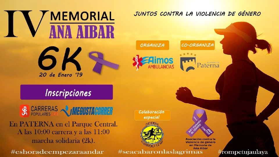 - AMBULANCIAS AIMOS S.L. ORGANIZA EN REPRESENTACION DE LA ASOCIACION CONTRA LA VIOLENCIA DE GENERO DE PATERNA EN MEMORIA DE ANA AIBAR- LA CARRERA POPULAR PATERNA CONTRA LA VIOLENCIA DE GENERO “IV MEMORIAL ANA AIBAR”.